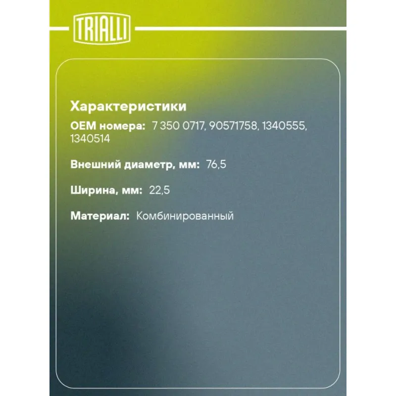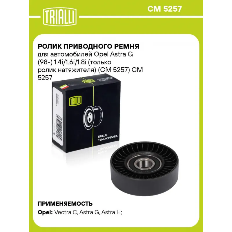 Ролик приводного ремня для автомобилей Opel Astra G (98-) 1.4i/1.6i/1.8i (только ролик натяжителя) (CM 5257) Характеристики: Артикул: CM 5257 OEM номера: 7 350 0717, 90571758, 1340555, 1340514 Сопутствующие товары:: 5PK1212, 5PK940, CM 2107 Сопутствующий товар: Ролики приводного ремня: CM 2107 Количество на автомобиль: 1 Внешний диаметр, мм: 76,5 Внутренний диаметр, мм: 17 Ширина, мм: 22,5 Гарантийный срок: 2 года/60 000 км. Материал: Комбинированный Сопутствующий товар: Ремни: 5PK1212, 5PK940 Товарная линейка: BLACK Подходит для авто: Opel Vectra C (02-), Astra G (98-), Astra H (04-) Для проверки применяемости отправьте VIN автомобиля через вкладку "Есть вопросы о товаре?" Комплектация: Ролик приводного ремня - 1 шт Гарантия: от 1 года.