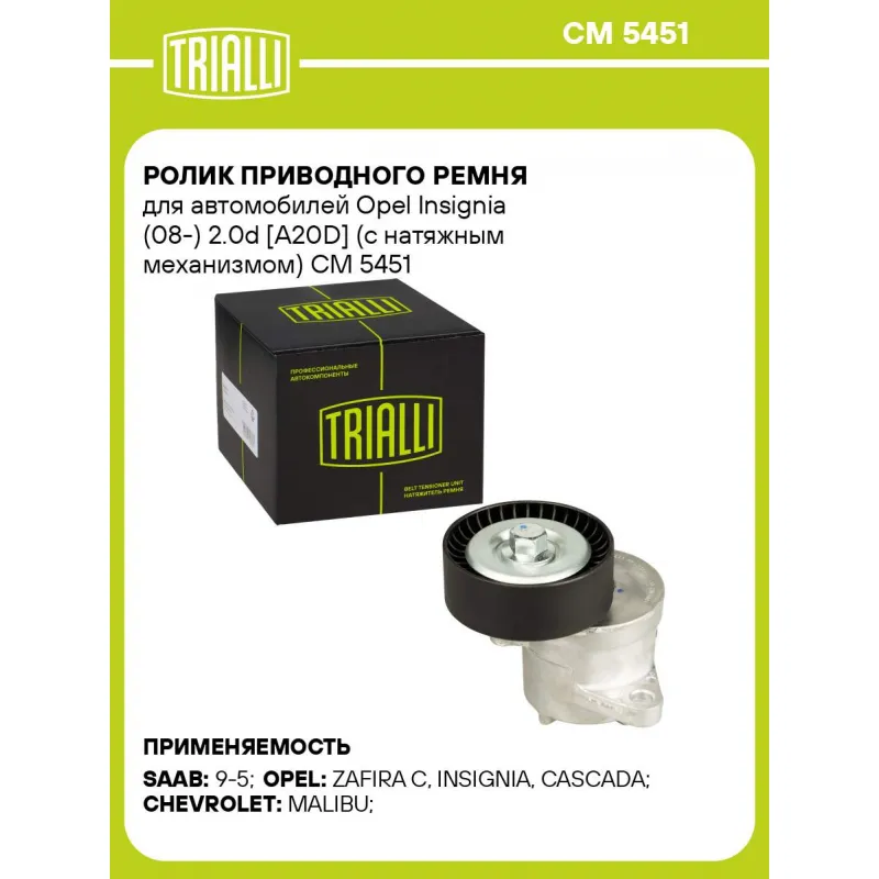 Ролик приводного ремня для автомобилей Opel Insignia (08-) 2.0d [A20D] (с натяжным механизмом) Характеристики: Артикул: CM 5451 OEM номера: 55 562 864, 1340269 Сопутствующие товары:: 6PK1900, 6PK1853E, CM 5119, CM 5603 Количество на автомобиль: 1 Внешний диаметр, мм: 70 Ширина, мм: 26 Гарантийный срок: 2 года/60 000 км. Материал: Комбинированный Сопутствующий товар: Ремни: 6PK1900, 6PK1853E Товарная линейка: BLACK Комплектация: Ролик привод. ремня с натяж. мех. - 1 шт Гарантия: от 1 года.