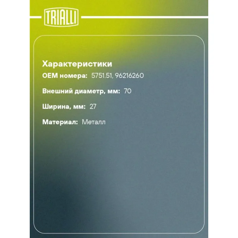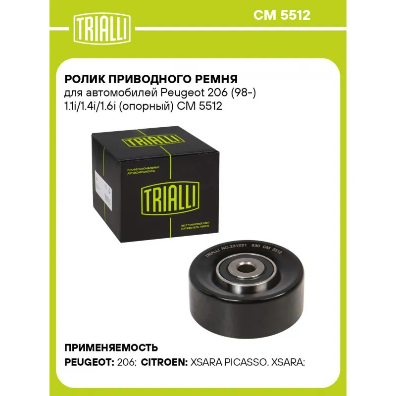 Ролик приводного ремня для автомобилей Peugeot 206 (98-) 1.1i/1.4i/1.6i (опорный) Характеристики: Артикул: CM 5512 OEM номера: 5751.51, 96216260 Сопутствующие товары:: CM 2004, CM 5412, CM 5837, CM 5615, CM 2002, CM 5083, CM 2005 Сопутствующий товар: Ролики приводного ремня: CM 2004, CM 5412, CM 5837, CM 5615, CM 2002, CM 5083, CM 2005 Количество на автомобиль: 1 Внешний диаметр, мм: 70 Внутренний диаметр, мм: 10 Ширина, мм: 27 Гарантийный срок: 2 года/60 000 км. Материал: Металл Товарная линейка: BLACK Комплектация: Ролик приводного ремня - 1 шт Гарантия: от 1 года.