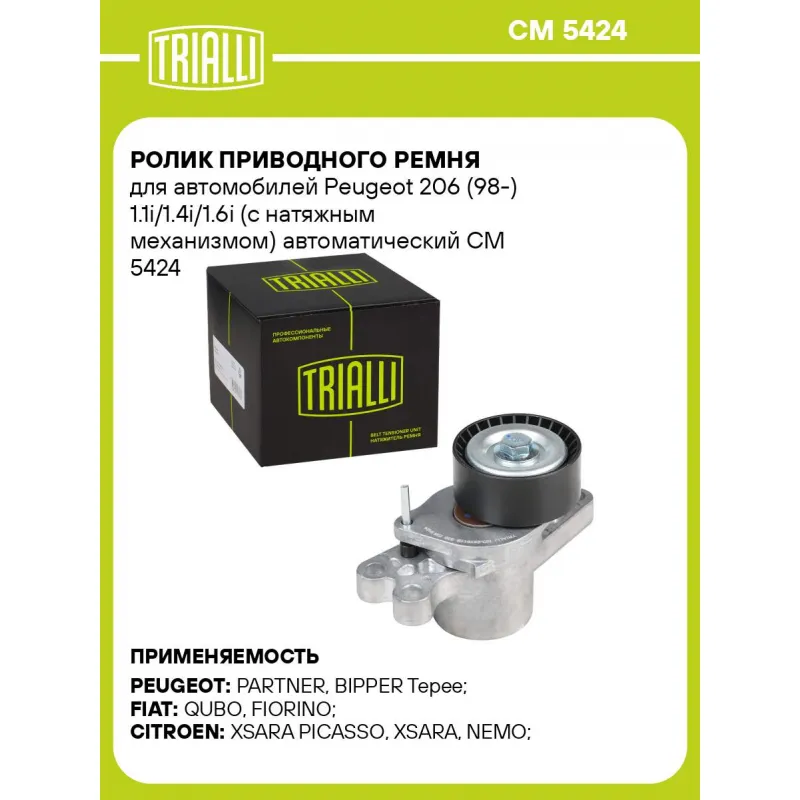 Ролик приводного ремня для автомобилей Peugeot 206 (98-) 1.1i/1.4i/1.6i (с натяжным механизмом) автоматический Характеристики: Артикул: CM 5424 OEM номера: 5751.97, 96389765, 9638976580, 96496758, 9649675880, 5751.A2, 5751C8 Сопутствующие товары:: 6PK1698, 6PK1564, 6PK1010, 6PK1125, 6PK1070, 6PK1050, 6PK1453, 6PK1225, 6PK730, AVX10X713, 5PK715, 5PK725 Ширина, мм: 26 Внешний диаметр, мм: 60 Сопутствующий товар: Ремни: 6PK1698, 6PK1564, 6PK1010, 6PK1125, 6PK1070, 6PK1050, 6PK1453, 6PK1225, 6PK730, AVX10X713 Количество на автомобиль: 1 Гарантийный срок: 2 года/60 000 км. Материал: Комбинированный Товарная линейка: BLACK Комплектация: Ролик привод. ремня с натяж. мех. - 1 шт Гарантия: от 1 года.