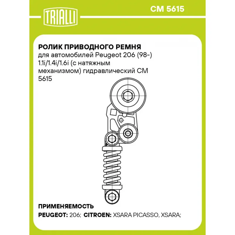 Ролик приводного ремня для автомобилей Peugeot 206 (98-) 1.1i/1.4i/1.6i (с натяжным механизмом) гидравлический Характеристики: Артикул: CM 5615 OEM номера: 5751.52 Сопутствующие товары:: CM 2004, CM 5412, CM 5837, CM 5512, CM 2002, CM 5083, CM 2005 Товарная линейка: BLACK Количество на автомобиль: 1 Гарантийный срок: 2 года/60 000 км. Материал: Комбинированный Комплектация: Ролик приводного ремня - 1 шт Гарантия: от 1 года.