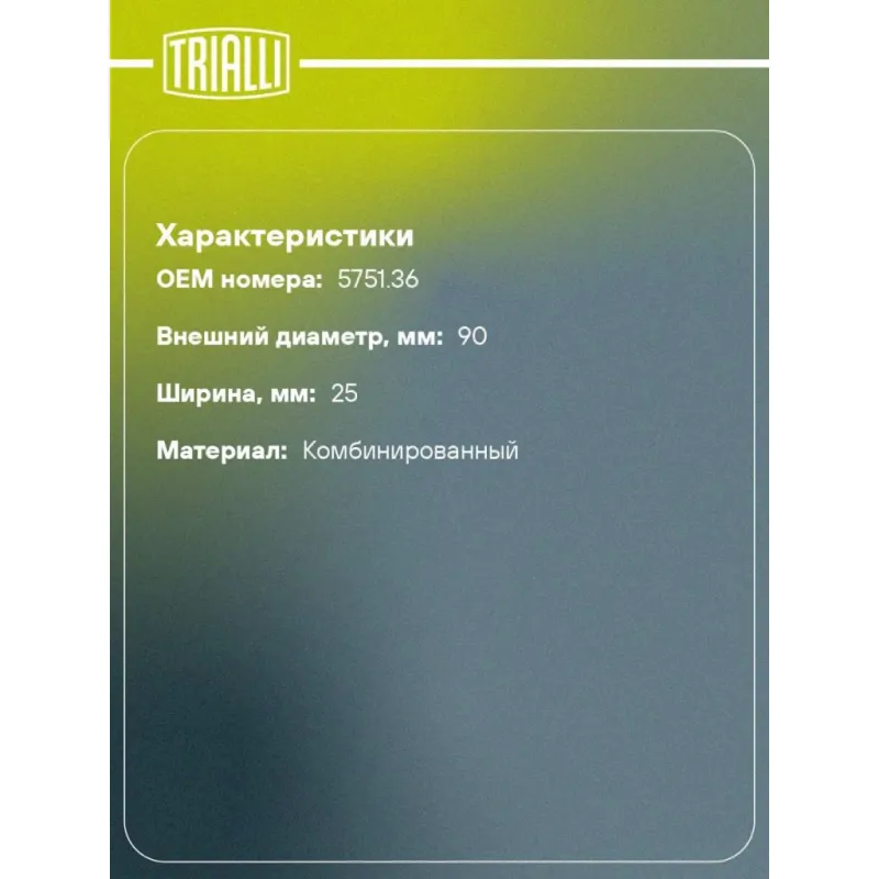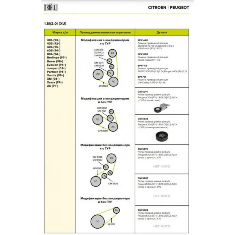 Ролик приводного ремня для автомобилей Peugeot 306 (93-) 1.8i/2.0i [XU] A/C+ (опорный с кронштейном) d90 Характеристики: Артикул: CM 5903 OEM номера: 5751.36 Сопутствующие товары:: 6PK1660, 6PK1080, 6PK1165, 6PK751, CM 5314, CM 5538, CM 5575, CM 5924 Ширина, мм: 25 Внешний диаметр, мм: 90 Сопутствующий товар: Ремни: 6PK1660, 6PK1080, 6PK1165, 6PK751 Количество на автомобиль: 1 Гарантийный срок: 2 года/60 000 км. Материал: Комбинированный Товарная линейка: BLACK Комплектация: Ролик приводного ремня - 1 шт Гарантия: от 1 года.
