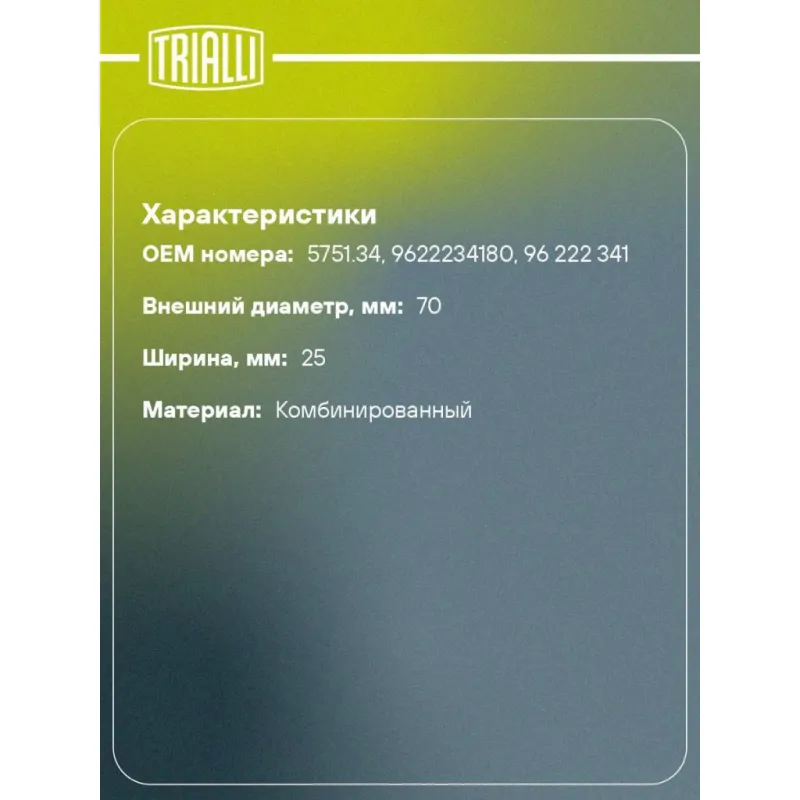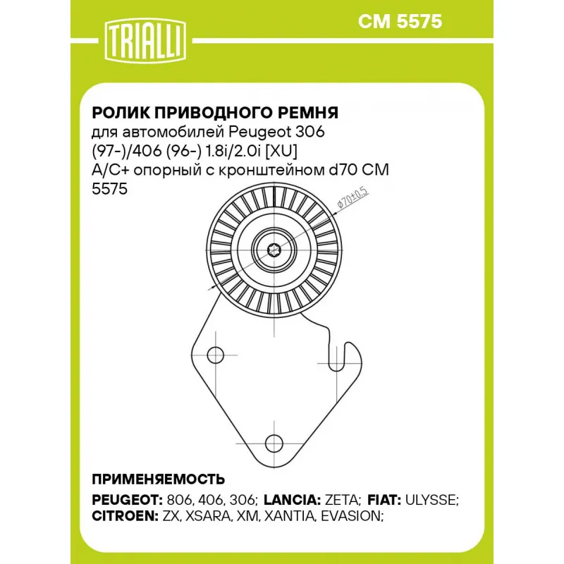 Ролик приводного ремня для автомобилей Peugeot 306 (97-)/406 (96-) 1.8i/2.0i [XU] A/C+ опорный с кронштейном d70 Характеристики: Артикул: CM 5575 OEM номера: 5751.34, 9622234180, 96 222 341 Сопутствующие товары:: 6PK1660, 6PK1080, 6PK1165, 6PK751, CM 5314, CM 5538, CM 5903, CM 5924 Количество на автомобиль: 1 Внешний диаметр, мм: 70 Ширина, мм: 25 Гарантийный срок: 2 года/60 000 км. Материал: Комбинированный Сопутствующий товар: Ремни: 6PK1660, 6PK1080, 6PK1165, 6PK751 Товарная линейка: BLACK Комплектация: Ролик приводного ремня - 1 шт Гарантия: от 1 года.