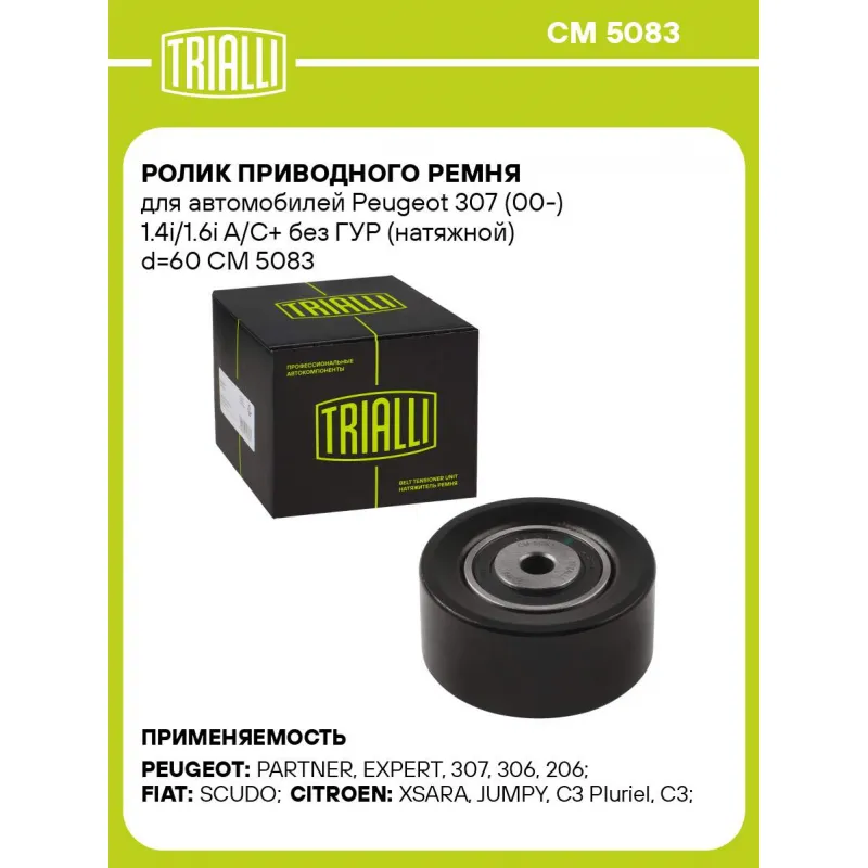 Ролик приводного ремня для автомобилей Peugeot 307 (00-) 1.4i/1.6i A/C+ без ГУР (натяжной) d=60 Характеристики: Артикул: CM 5083 OEM номера: 5751.47, 9628990280, 96420067, 9642006780, 575184, 5751.91, 16 138 382 80, 96289902 Сопутствующие товары:: CM 2004, CM 5412, CM 5837, CM 5615, CM 5512, CM 2002, CM 2005 Сопутствующий товар: Ролики приводного ремня: CM 2004, CM 5412, CM 5837, CM 5615, CM 5512, CM 2002, CM 2005 Количество на автомобиль: 1 Внешний диаметр, мм: 60 Внутренний диаметр, мм: 8,2 Ширина, мм: 26,5 Гарантийный срок: 2 года/60 000 км. Товарная линейка: BLACK Комплектация: Ролик приводного ремня - 1 шт Гарантия: от 1 года.