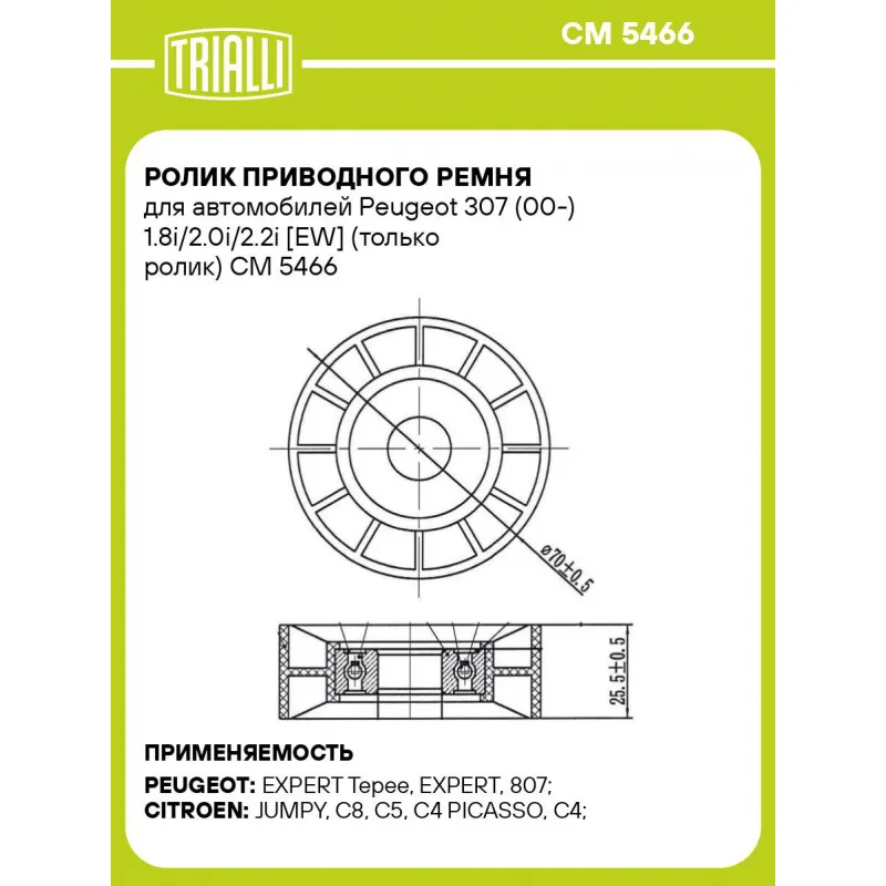Ролик приводного ремня для автомобилей Peugeot 307 (00-) 1.8i/2.0i/2.2i [EW] (только ролик) Характеристики: Артикул: CM 5466 OEM номера: 5751.G8, 5751.C0, 9663566180 Сопутствующие товары:: 6PK1000, CM 5350 Ширина, мм: 25.5 Внешний диаметр, мм: 70 Товарная линейка: BLACK Количество на автомобиль: 1 Гарантийный срок: 2 года/60 000... Читать полностью →