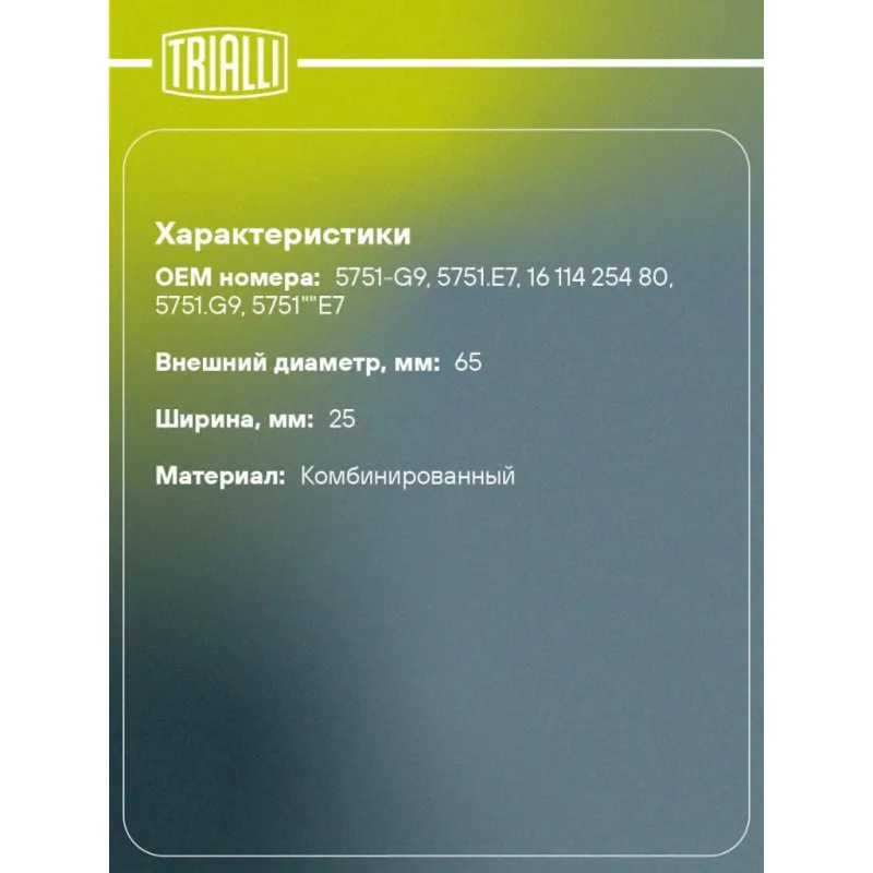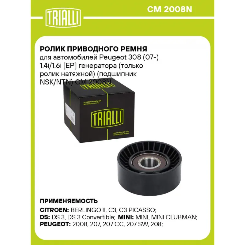 Ролик приводного ремня для автомобилей Peugeot 308 (07-) 1.4i/1.6i [EP] генератора (только ролик натяжной) (подшипник NSK/NTN) Характеристики: Артикул: CM 2008N OEM номера: 5751-G9, 5751.E7, 16 114 254 80, 5751.G9, 5751""E7, 5751E7 Ширина, мм: 25 Внешний диаметр, мм: 65 Внутренний диаметр, мм: 17 Гарантийный срок: 2 года/80 000 ... Читать полностью →