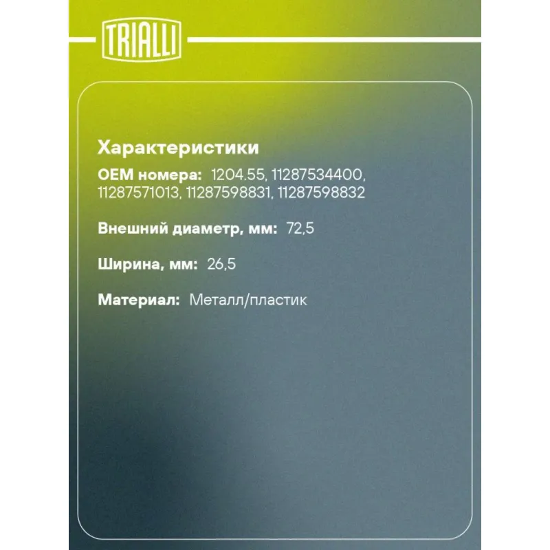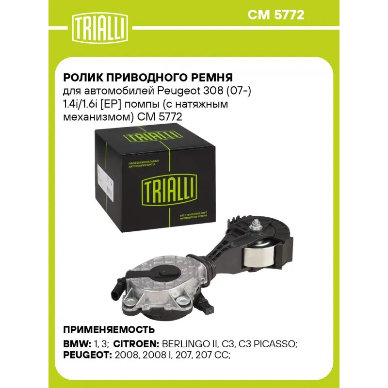 Ролик приводного ремня для автомобилей Peugeot 308 (07-) 1.4i/1.6i [EP] помпы (с натяжным механизмом) Характеристики: Артикул: CM 5772 OEM номера: 1204.55, 11287534400, 11287571013, 11287598831, 11287598832 Сопутствующие товары:: 6PK905, 6PK903E, CM 5473, CM 2008, CM 2604, CM 5496 Сопутствующий товар: Ролики приводного ремня: CM 5473, CM 2008, CM 2604, CM 5496 Количество на автомобиль: 1 Внешний диаметр, мм: 72,5 Ширина, мм: 26,5 Гарантийный срок: 2 года/60 000 км. Материал: металл/пластик Сопутствующий товар: Ремни: 6PK905, 6PK903E Товарная линейка: BLACK Комплектация: Ролик привод. ремня с натяж. мех. - 1 шт Гарантия: от 1 года.