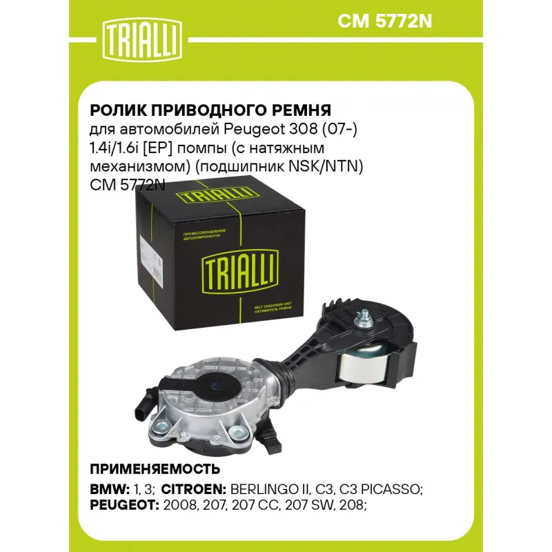 Ролик приводного ремня для автомобилей Peugeot 308 (07-) 1.4i/1.6i [EP] помпы (с натяжным механизмом) (подшипник NSK/NTN) Характеристики: Артикул: CM 5772N OEM номера: 11287598832, 11287534400, 11287571013, 11287598831, 1204.55 Ширина, мм: 26.5 Внешний диаметр, мм: 72.5 Гарантийный срок: 2 года/80 000 км. Количество на автомобил... Читать полностью →