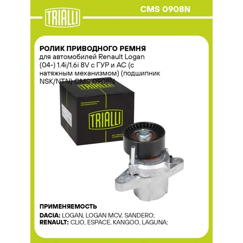 Ролик приводного ремня для автомобилей Renault Logan (04-) 1.4i/1.6i 8V с ГУР и AC (с натяжным механизмом) (подшипник NSK/NTN) Характеристики: Артикул: CMS 0908N OEM номера: 11925-00QAL, 11925-00QAA, 11925-00Q0D, 11750-00Q0F, 8200403954, 8200603359, 8200277606, 7700102872, 82 00 169 191 Ширина, мм: 26 Внешний диаметр, мм: 60.1 Внутренний диаметр, мм: 9 Гарантийный срок: 2 года/80 000 км. Количество на автомобиль: 1 Материал: Комбинированный Товарная линейка: BLACK Комплектация: Ролик привод. ремня с натяж. мех. - 1 шт Гарантия: от 1 года.