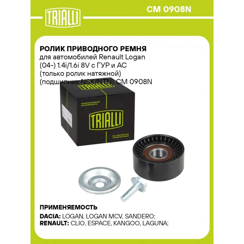 Ролик приводного ремня для автомобилей Renault Logan (04-) 1.4i/1.6i 8V с ГУР и AC (только ролик натяжной) (подшипник NSK/NTN) Характеристики: Артикул: CM 0908N OEM номера: 11925-00QAL, 11925-00QAA, 11925-00Q0D, 11750-00Q0F, 8200403954, 8200603359, 8200277606, 7700102872, 82 00 169 191 Ширина, мм: 26 Внешний диаметр, мм: 60.1 Внутренний диаметр, мм: 9 Гарантийный срок: 2 года/80 000 км. Количество на автомобиль: 1 Материал: Комбинированный Товарная линейка: BLACK Комплектация: Ролик приводного ремня - 1 шт Гарантия: от 1 года.