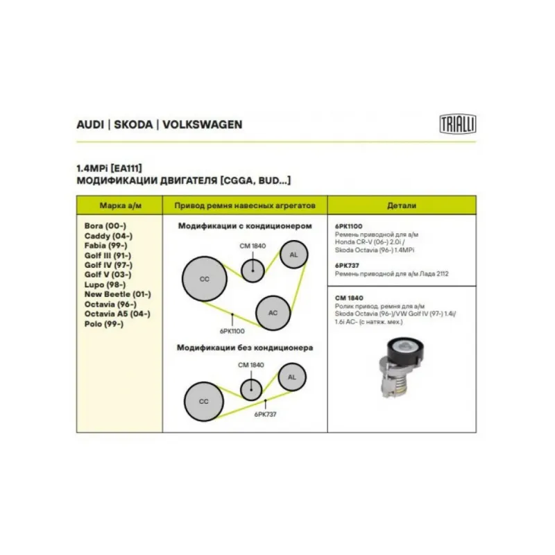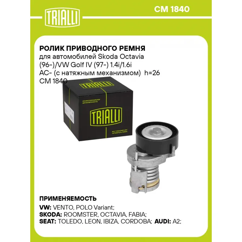 Ролик приводного ремня для автомобилей Skoda Octavia (96-)/VW Golf IV (97-) 1.4i/1.6i AC- (с натяжным механизмом) h=26 Характеристики: Артикул: CM 1840 OEM номера: 030 145 299 F, 030145299C Количество на автомобиль: 1 Сопутствующие товары:: 6PK1100, 6PK737 Внешний диаметр, мм: 70,3 Ширина, мм: 26 Гарантийный срок: 2 года/60 000 км. Материал: Комбинированный Сопутствующий товар: Ремни: 6PK1100, 6PK737 Товарная линейка: BLACK Комплектация: Ролик приводного ремня с натяжным механизмом - 1 шт Гарантия: от 1 года.