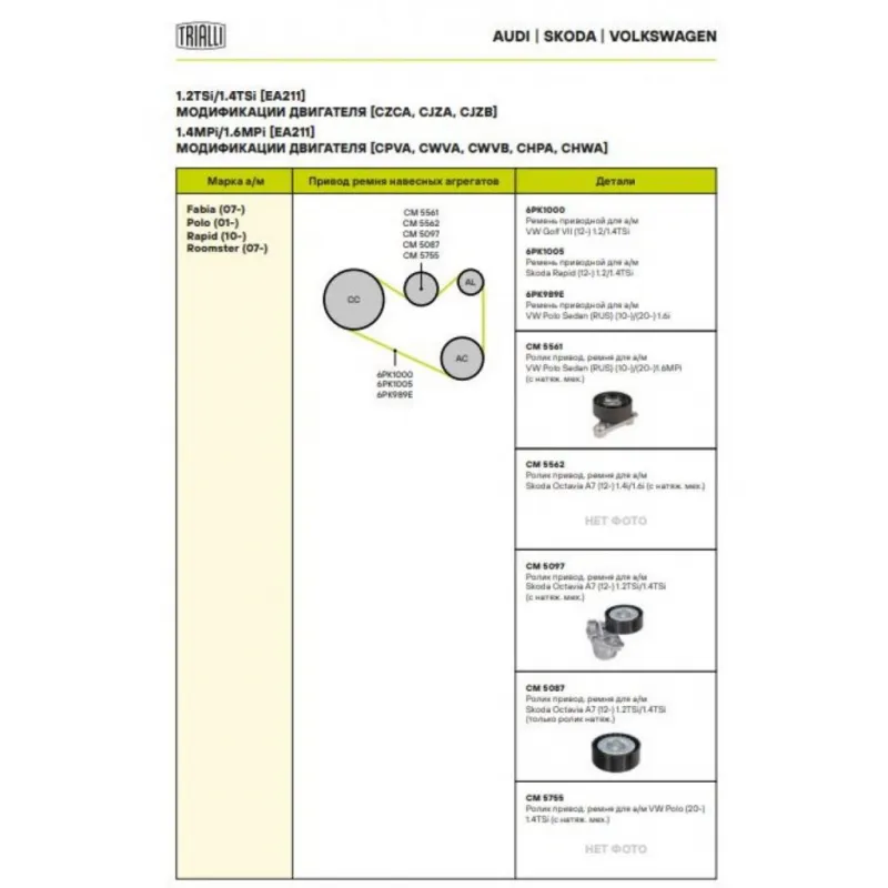 Ролик приводного ремня для автомобилей Skoda Octavia A7 (13-) 1.4i/1.6i (с натяжым механизмом) Характеристики: Артикул: CM 5562 OEM номера: 04E145299AG, 04E145299E Сопутствующие товары:: CM 5561, CM 5097, CM 5087, CM 5755, 6PK1000, 6PK1005, 6PK989E Ширина, мм: 26 Внешний диаметр, мм: 65 Внутренний диаметр, мм: 8,2 Количество на автомобиль: 1 Гарантийный срок: 2 года/60 000 км. Материал: Комбинированный Сопутствующий товар: Ремни: 6PK1000, 6PK1005, 6PK989E Товарная линейка: BLACK Комплектация: Ролик привод. ремня с натяж. мех. - 1 шт Гарантия: от 1 года.
