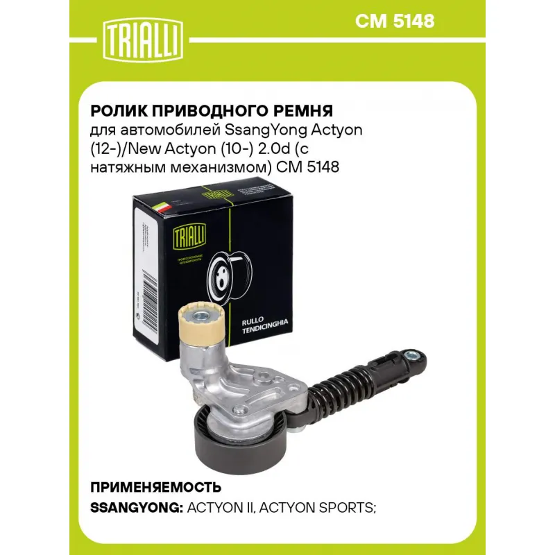 Ролик приводного ремня для автомобилей SsangYong Actyon (12-)/New Actyon (10-) 2.0d (с натяжным механизмом) Характеристики: Артикул: CM 5148 OEM номера: 67120-00270, 67120-00370, 6719920075 Количество на автомобиль: 1 Внешний диаметр, мм: 70 Ширина, мм: 26 Гарантийный срок: 2 года/60 000 км. Материал: Комбинированный Товарная ли... Читать полностью →