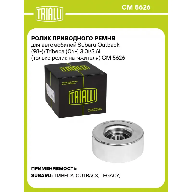 Ролик приводного ремня для автомобилей Subaru Outback (98-)/Tribeca (06-) 3.0i/3.6i (только ролик натяжителя) Характеристики: Артикул: CM 5626 OEM номера: 23769-AA000, 23769AA001, 23769AA002, 23769AA003 Сопутствующие товары:: 6PK1590, CM 5513, CM 5117 Сопутствующий товар: Ролики приводного ремня: CM 5513, CM 5117 Количество на автомобиль: 1 Внешний диаметр, мм: 80 Ширина, мм: 32 Гарантийный срок: 2 года/60 000 км. Сопутствующий товар: Ремни: 6PK1590 Товарная линейка: BLACK Комплектация: Ролик приводного ремня - 1 шт Гарантия: от 1 года.
