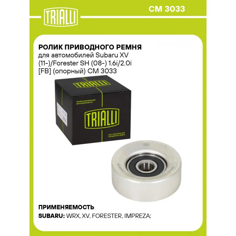 Ролик приводного ремня для автомобилей Subaru XV (11-)/Forester SH (08-) 1.6i/2.0i [FB] (опорный) Характеристики: Артикул: CM 3033 OEM номера: 23770AA070 Товарная линейка: BLACK Количество на автомобиль: 1 Внешний диаметр, мм: 80 Внутренний диаметр, мм: 17 Ширина, мм: 27 Гарантийный срок: 2 года/60 000 км. Материал: Металл Комплектация: Ролик приводного ремня - 1 шт Гарантия: от 1 года.