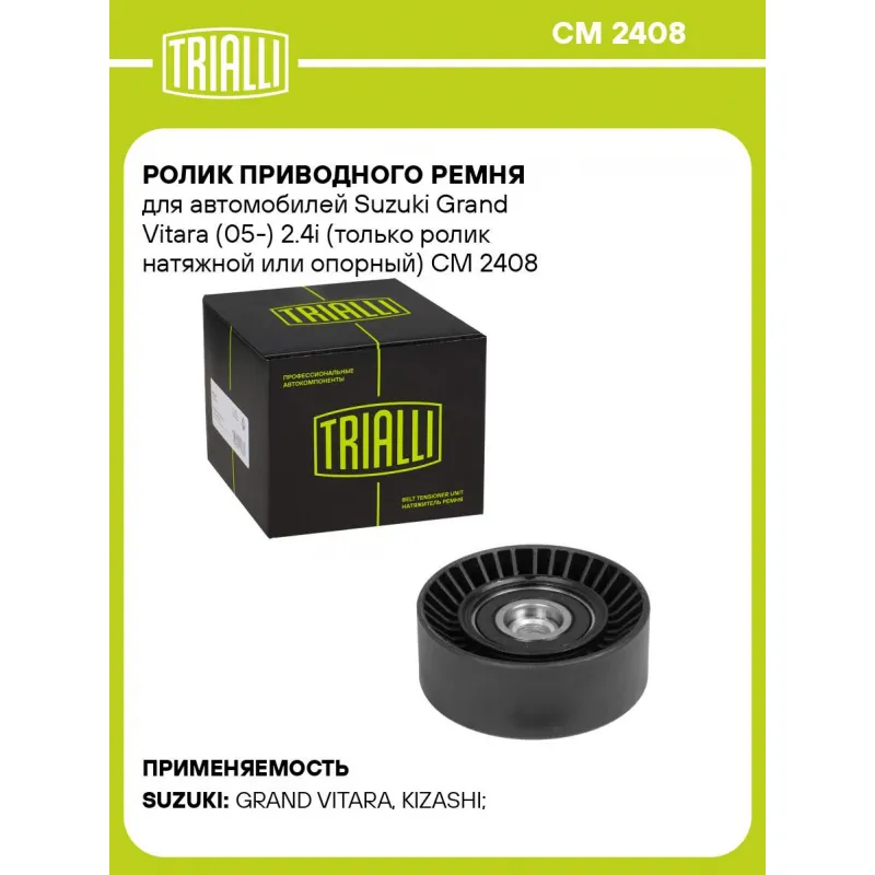 Ролик приводного ремня для автомобилей Suzuki Grand Vitara (05-) 2.4i (только ролик натяжной или опорный) Характеристики: Артикул: CM 2408 OEM номера: 23769AA040S, 1754078K00, 1754054L00RX0, 1754054L00000, 17540-54L00, 17540-54L01, 1753078K01, 1753078K01000 Количество на автомобиль: 1 Внешний диаметр, мм: 70 Внутренний диаметр, мм: 10.2 Ширина, мм: 26 Гарантийный срок: 2 года/60 000 км. Материал: Комбинированный Товарная линейка: BLACK Комплектация: Ролик приводного ремня - 1 шт Гарантия: от 1 года.