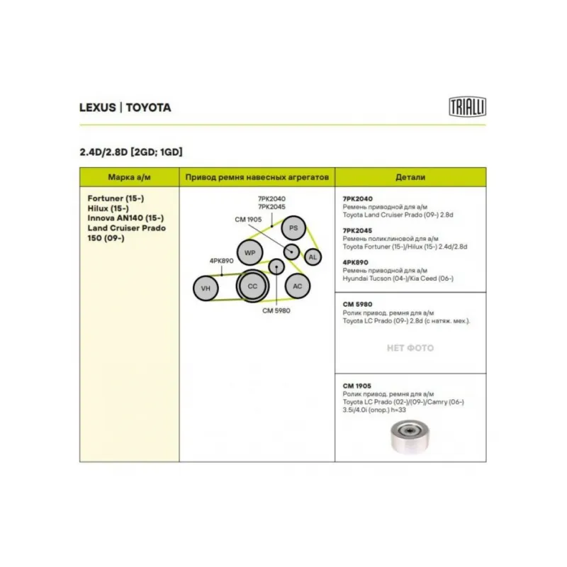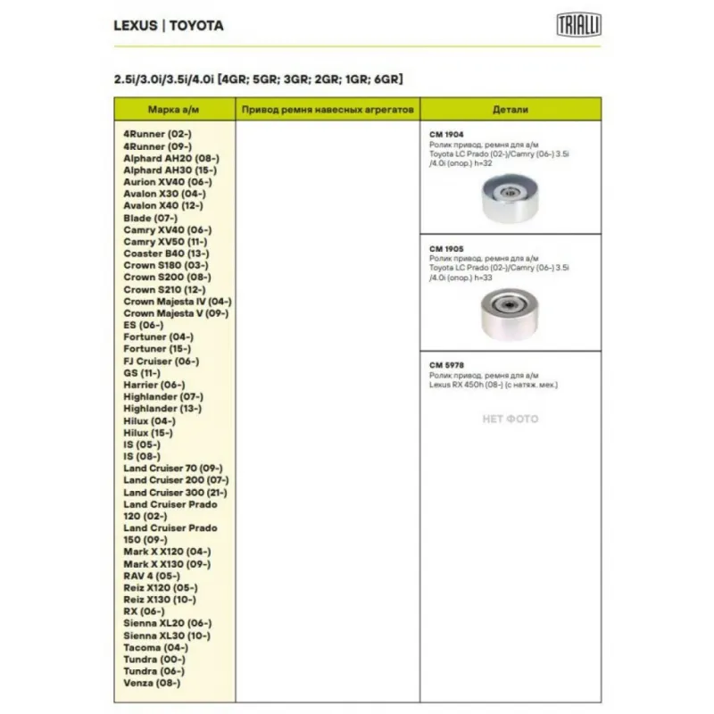 Ролик приводного ремня для автомобилей Toyota Camry (06-)/Land Cruiser Prado (02-)/Land Cruiser Prado (09-)/Highlander (08-) 2.7i/2.8d/3.5i/4.0i [TR; RZ; GD; GR] (опорный) h=33 (CM 1905) Характеристики: Артикул: CM 1905 OEM номера: 166030P020, 166030P030, 166030E010, 16603-0C013, 166030C011, 166030C012, 16603-31040, 16603-31030, 16603-31010, 16603-31050 Количество на автомобиль: 1 Внешний диаметр, мм: 70 Особенности конструкции:: приводной Внутренний диаметр, мм: 11 Ширина, мм: 33 Гарантийный срок: 2 года/60 000 км. Материал: Металл Товарная линейка: BLACK Подходит для авто: Toyota Land Cruiser Prado 120 (02-), Camry (06-), Tundra (06-) Для проверки применяемости отправьте VIN автомобиля через вкладку "Есть вопросы о товаре?" Комплектация: Ролик приводного ремня - 1 шт Гарантия: от 1 года.