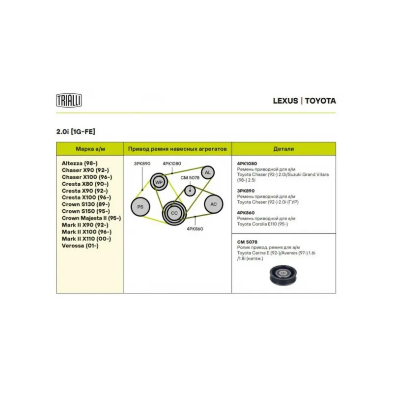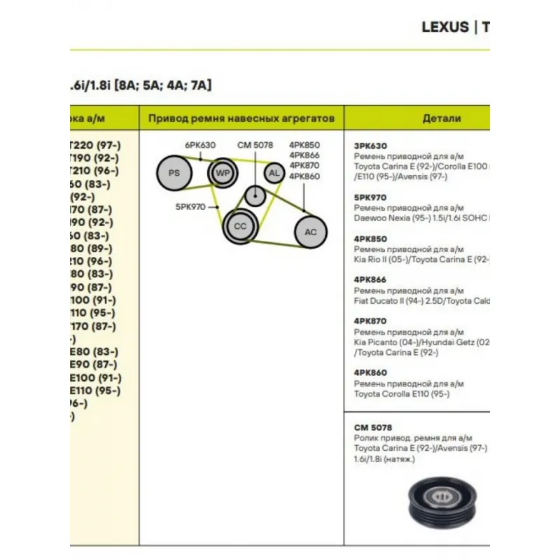 Ролик приводного ремня для автомобилей Toyota Carina E (92-)/Avensis (97-) 1.5i/1.6i/1.8i [A]/[E] (натяжной ролик кондиционера) (CM 5078) Характеристики: Артикул: CM 5078 OEM номера: 8844017010, 8844020160, 8844020170, 44350-34010, 8844026100, 8844004040 Количество на автомобиль: 1 Внешний диаметр, мм: 73 Внутренний диаметр, мм: 11 Ширина, мм: 21 Гарантийный срок: 2 года/60 000 км. Материал: Металл Товарная линейка: BLACK Комплектация: Ролик приводного ремня - 1 шт Гарантия: от 1 года.