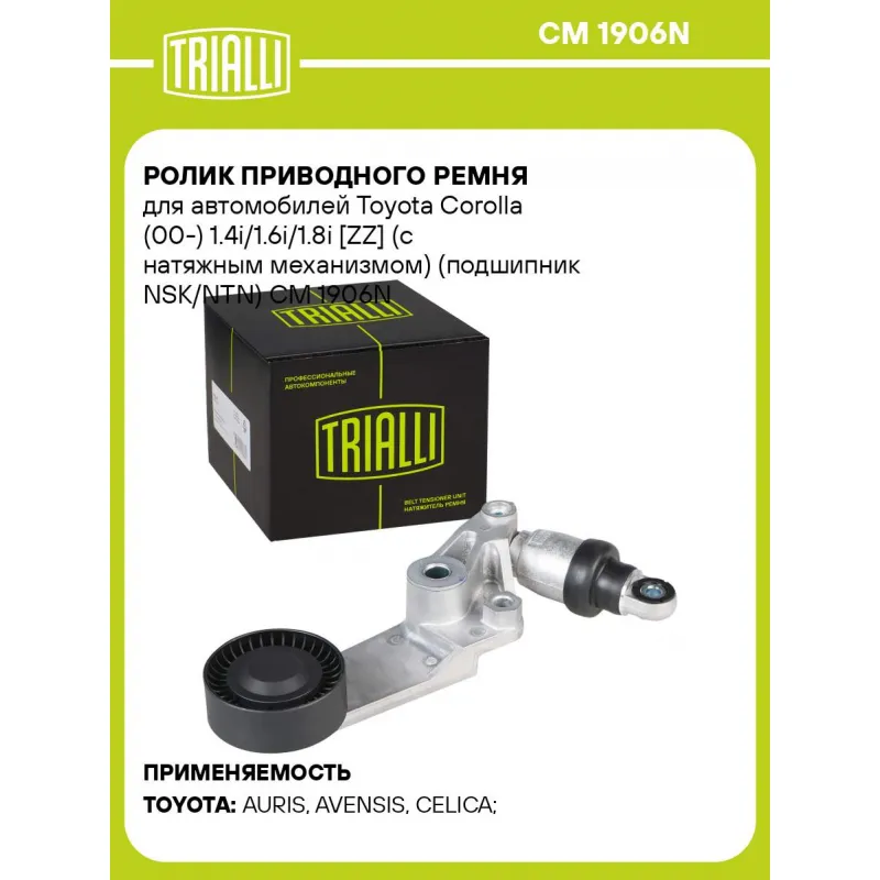 Ролик приводного ремня для автомобилей Toyota Corolla (00-) 1.4i/1.6i/1.8i [ZZ] (с натяжным механизмом) (подшипник NSK/NTN) Характеристики: Артикул: CM 1906N OEM номера: 166200D021, 166200W092C, 16620 22013, 16620 22012, 16620 22011, 16620 22010, 16620 0W093, 16620.0W092, 16620.0W091, 16620.0W090 Ширина, мм: 26 Внешний диаметр, мм: 70 Внутренний диаметр, мм: 8.2 Гарантийный срок: 2 года/80 000 км. Количество на автомобиль: 1 Материал: Комбинированный Товарная линейка: BLACK Комплектация: Ролик привод. ремня с натяж. мех. - 1 шт Гарантия: от 1 года.