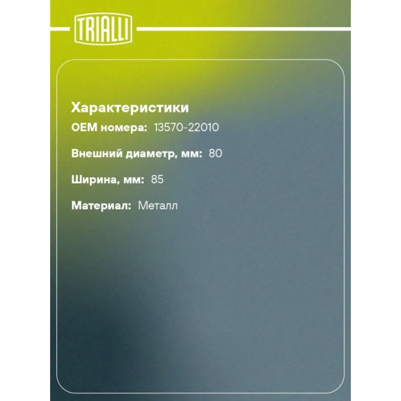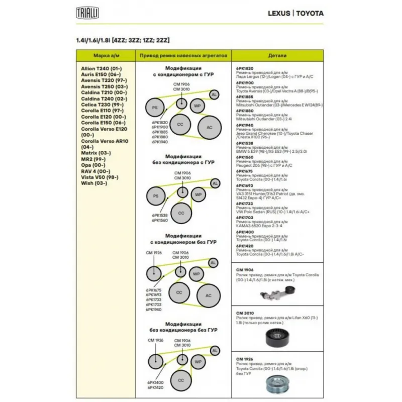 Ролик приводного ремня для автомобилей Toyota Corolla (00-) 1.4i/1.6i/1.8i (опорный) без ГУР (CM 1926) Характеристики: Артикул: CM 1926 OEM номера: 13570-22010 Количество на автомобиль: 1 Внешний диаметр, мм: 80 Внутренний диаметр, мм: 10 Ширина, мм: 85 Гарантийный срок: 2 года/60 000 км. Материал: Металл Товарная линейка: BLACK Комплектация: Ролик приводного ремня - 1 шт Гарантия: от 1 года.