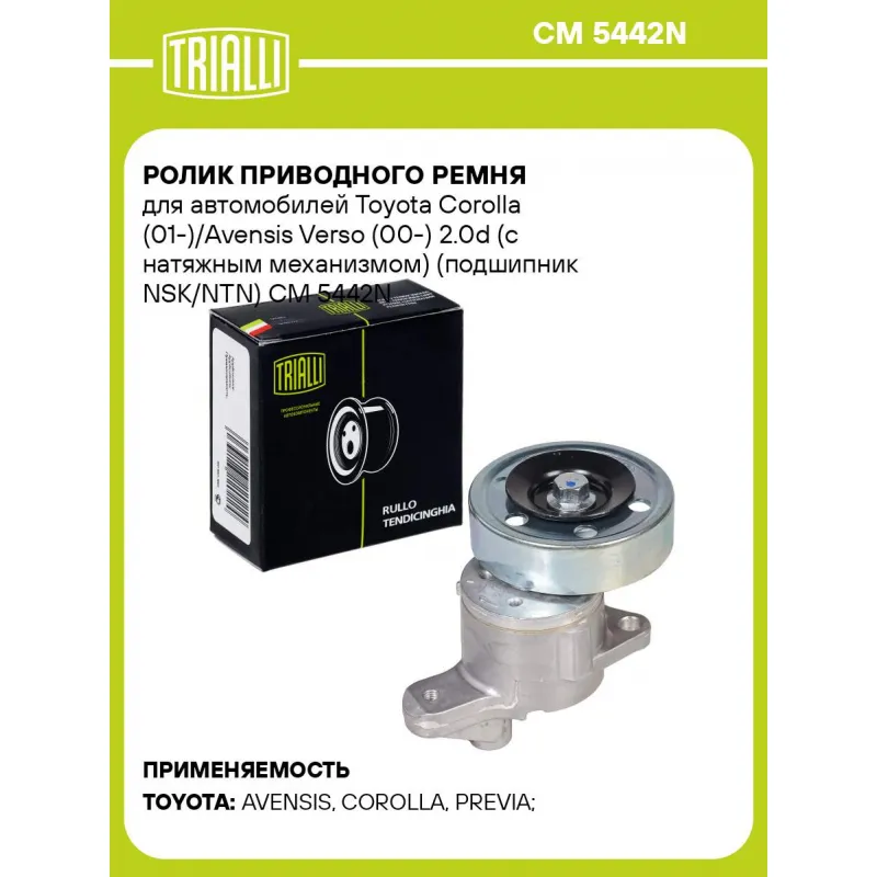 Ролик приводного ремня для автомобилей Toyota Corolla (01-)/Avensis Verso (00-) 2.0d (с натяжным механизмом) (подшипник NSK/NTN) Характеристики: Артикул: CM 5442N OEM номера: 16603-27011, 16620-27021, 16620-27020, 16603-27010 Ширина, мм: 24.5 Внешний диаметр, мм: 90 Гарантийный срок: 2 года/80 000 км. Количество на автомобиль: 1 Материал: Комбинированный Товарная линейка: BLACK Комплектация: Ролик привод. ремня с натяж. мех. - 1 шт Гарантия: от 1 года.