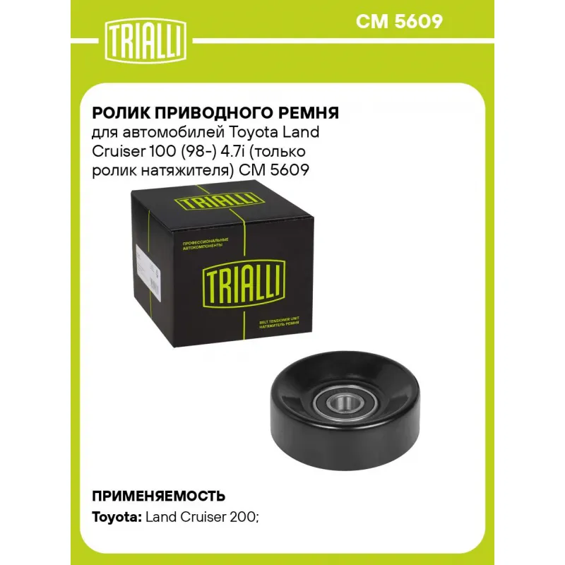 Ролик приводного ремня для автомобилей Toyota Land Cruiser 100 (98-) 4.7i (только ролик натяжителя) Характеристики: Артикул: CM 5609 OEM номера: 12580771, 166200W036, 166030W030, 12580773, 16620-0W036, 166200W101, 166200W100, 166030W010 Сопутствующие товары:: 6PK2345, 6PK2360, 6PK2370, 4PK962, 4PK1010E, CM 5862, CM 5106 Сопутствующий товар: Ролики приводного ремня: CM 5862, CM 5106 Количество на автомобиль: 1 Внешний диаметр, мм: 90 Ширина, мм: 30 Гарантийный срок: 2 года/60 000 км. Материал: Комбинированный Сопутствующий товар: Ремни: 6PK2345, 6PK2360, 6PK2370, 4PK962, 4PK1010E Товарная линейка: BLACK Подходит для авто: Toyota Land Cruiser 200 (07-), Land Cruiser 100 (98-) Для проверки применяемости отправьте VIN автомобиля через вкладку "Есть вопросы о товаре?" Комплектация: Ролик приводного ремня - 1 шт Гарантия: от 1 года.