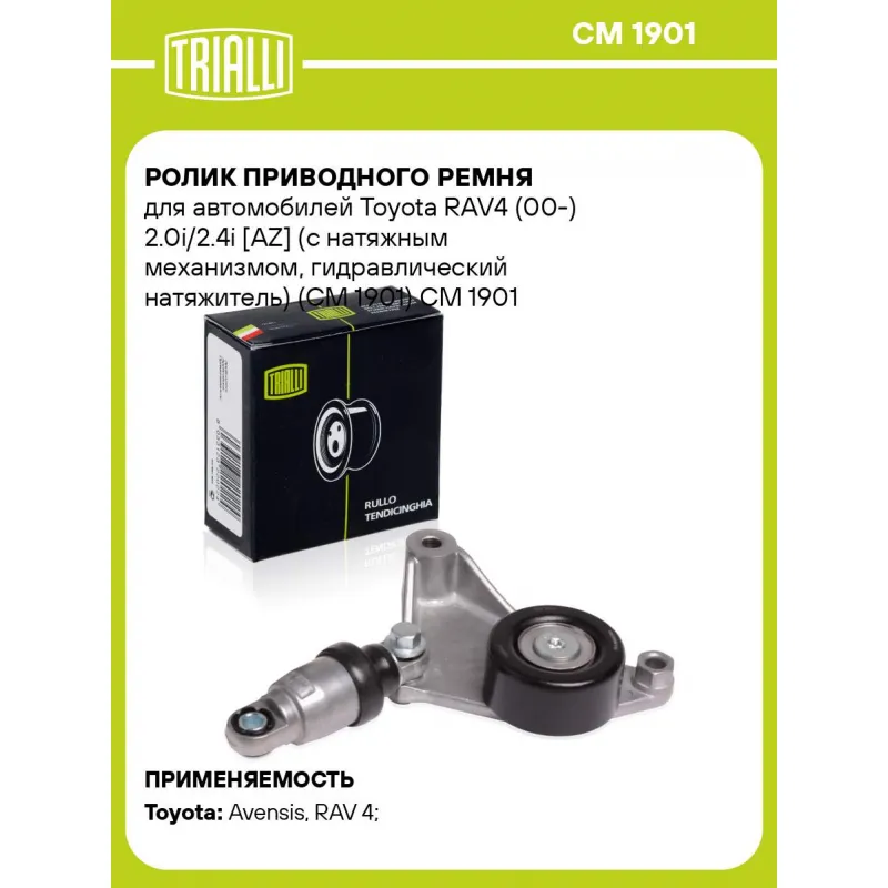 Ролик приводного ремня для автомобилей Toyota RAV4 (00-) 2.0i/2.4i [AZ] (с натяжным механизмом, гидравлический натяжитель) (CM 1901) Характеристики: Артикул: CM 1901 OEM номера: 166200W110, 1662028010, 1662028011, 1662028012, 1662028070, 1662028071, 1662028090 Сопутствующие товары:: CM 1910 Особенности конструкции:: механизм натяжения приводного ремня Сопутствующий товар: Ролики приводного ремня: CM 1910 Количество на автомобиль: 1 Внешний диаметр, мм: 70 Ширина, мм: 31.5 Гарантийный срок: 2 года/60 000 км. Материал: металл/пластик Товарная линейка: BLACK Подходит для авто: Toyota Avensis (97-), Avensis (03-), Avensis (03-), RAV 4 (00-), RAV 4 (06-) Для проверки применяемости отправьте VIN автомобиля через вкладку "Есть вопросы о товаре?" Комплектация: Ролик привод. ремня с натяж. мех. - 1 шт Гарантия: от 1 года.