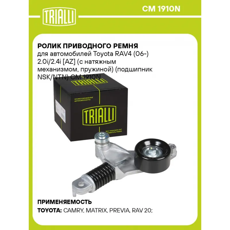 Ролик приводного ремня для автомобилей Toyota RAV4 (06-) 2.0i/2.4i [AZ] (с натяжным механизмом, пружиной) (подшипник NSK/NTN) Характеристики: Артикул: CM 1910N OEM номера: 166200H021, 16620-28041, 16620-28040, 16620-0H020 Ширина, мм: 33.5 Внешний диаметр, мм: 70 Внутренний диаметр, мм: 10 Гарантийный срок: 2 года/80 000 км. Коли... Читать полностью →
