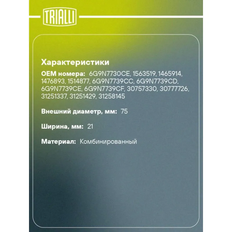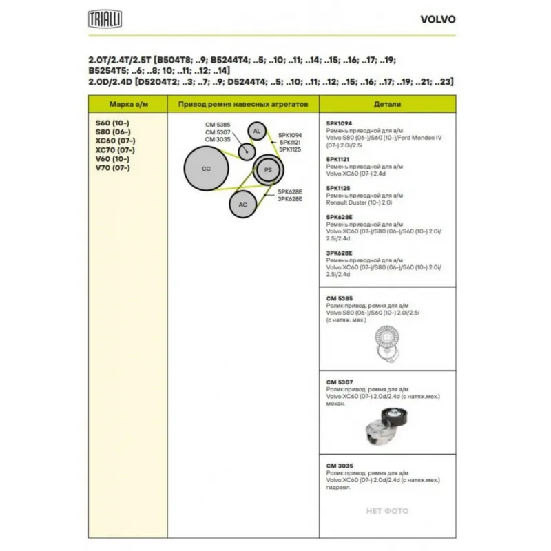 Ролик приводного ремня для автомобилей Volvo XC60 (07-)/S80 (06-)/S80 (06-)/S60 (10-) 2.0i/2.4i/2.5i с натяжным механизмом Характеристики: Артикул: CM 5385 OEM номера: 6G9N7730CE, 1563519, 1465914, 1476893, 1514877, 6G9N7739CC, 6G9N7739CD, 6G9N7739CE, 6G9N7739CF, 30757330, 30777726, 31251337, 31251429, 31258145, 31258153 Сопутствующие товары:: 5PK1094, 5PK1121, 5PK628E Сопутствующий товар: Ремни: 5PK1094, 5PK1121, 5PK628E Количество на автомобиль: 1 Внешний диаметр, мм: 75 Ширина, мм: 21 Гарантийный срок: 2 года/60 000 км. Материал: Комбинированный Товарная линейка: BLACK Комплектация: Ролик привод. ремня с натяж. мех. - 1 шт Гарантия: от 1 года.