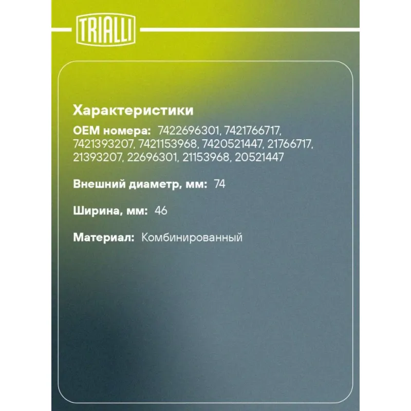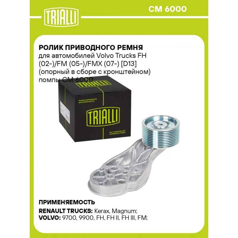 Ролик приводного ремня для автомобилей Volvo Trucks FH (02-)/FM (05-)/FMX (07-) [D13] (опорный в сборе с кронштейном) помпы Характеристики: Артикул: CM 6000 OEM номера: 7422696301, 7421766717, 7421393207, 7421153968, 7420521447, 21766717, 21393207, 22696301, 21153968, 20521447 Ширина, мм: 46 Внешний диаметр, мм: 74 Внутренний диаметр, мм: 10,4 Гарантийный срок: 2 года/60 000 км. Количество на автомобиль: 1 Материал: Комбинированный Товарная линейка: BLACK Комплектация: Ролик привод. ремня с натяж. мех. - 1 шт Гарантия: от 1 года.