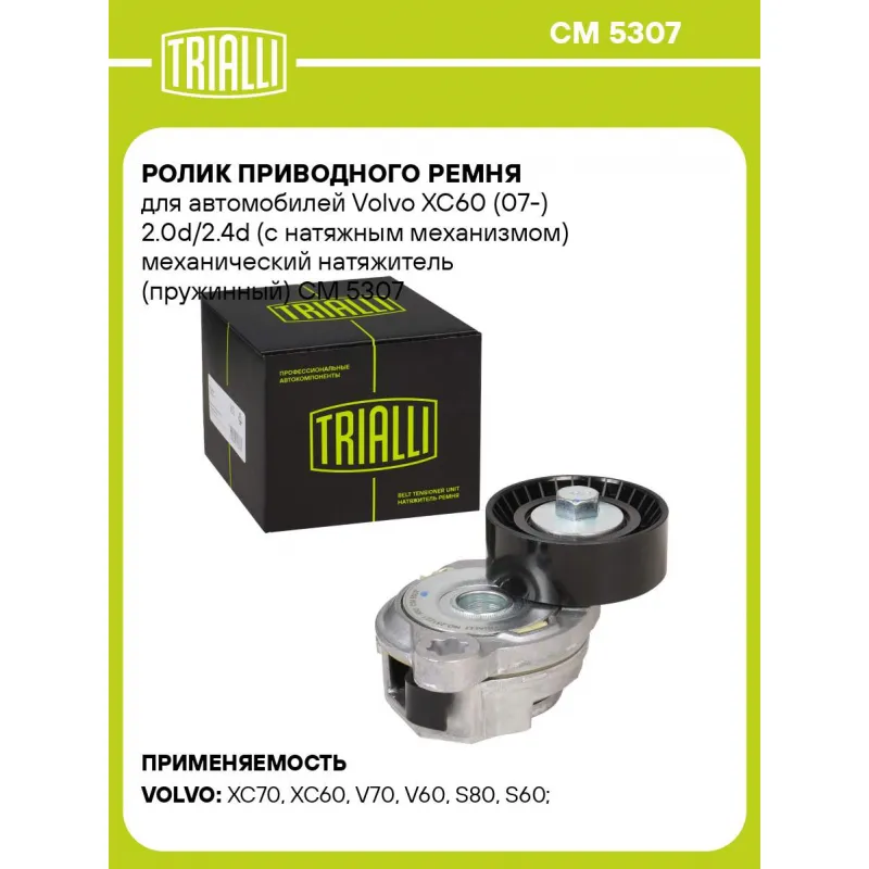 Ролик приводного ремня для автомобилей Volvo XC60 (07-) 2.0d/2.4d (с натяжным механизмом) механический натяжитель (пружинный) Характеристики: Артикул: CM 5307 OEM номера: 31330379 Количество на автомобиль: 1 Внешний диаметр, мм: 65 Внутренний диаметр, мм: 8.2 Ширина, мм: 23.5 Гарантийный срок: 2 года/60 000 км. Материал: Комбини... Читать полностью →