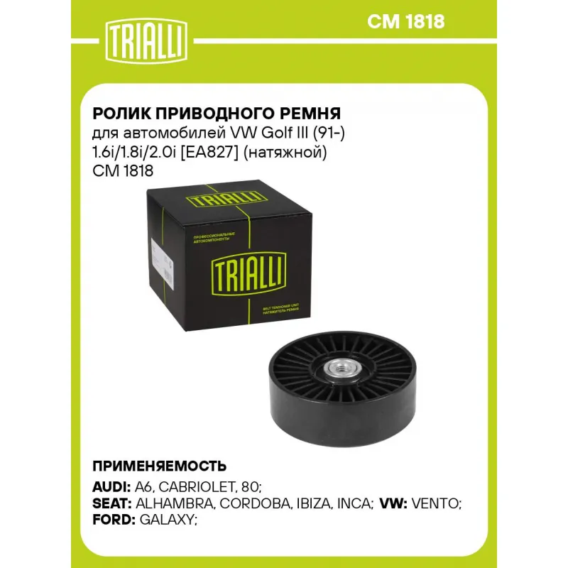 Ролик приводного ремня для автомобилей VW Golf III (91-) 1.6i/1.8i/2.0i [EA827] (натяжной) Характеристики: Артикул: CM 1818 OEM номера: 1051901, VX028145278EVX, 028145278E, 028145278A, 028145278, 02814528E Сопутствующий товар: Ролики приводного ремня: CM 5490 Количество на автомобиль: 1 Сопутствующие товары:: CM 5490, 6PK894, 6PK976, 6PK1033, 6PK1153, 6PK1145, AVX10X750, AVX10X788 Внешний диаметр, мм: 78 Внутренний диаметр, мм: 9 Ширина, мм: 27 Гарантийный срок: 2 года/60 000 км. Материал: Комбинированный Сопутствующий товар: Ремни: 6PK894, 6PK976, 6PK1033, 6PK1153, 6PK1145, AVX10X750, AVX10X788 Товарная линейка: BLACK Комплектация: Ролик приводного ремня - 1 шт Гарантия: от 1 года.