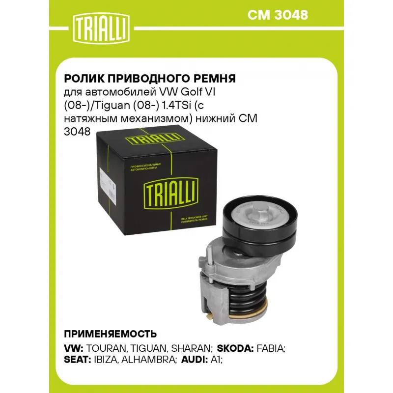 Ролик приводного ремня для автомобилей VW Golf VI (08-)/Tiguan (08-) 1.4TSi (с натяжным механизмом) нижний Характеристики: Артикул: CM 3048 OEM номера: 03C145299AC, 03C145299L, 03C 145 299 K, 03C 145 299 P, 03C 145 299 AF Сопутствующие товары:: CM 5381, CM 5085, CM 5756, CM 5519, 6PK1698, 6PK1600, 6PK491 Сопутствующий товар: Ролики приводного ремня: CM 5381, CM 5085, CM 5756, CM 5519 Количество на автомобиль: 1 Внешний диаметр, мм: 65 Ширина, мм: 26 Гарантийный срок: 2 года/60 000 км. Сопутствующий товар: Ремни: 6PK1698, 6PK1600, 6PK491 Товарная линейка: BLACK Комплектация: Ролик привод. ремня с натяж. мех. - 1 шт Гарантия: от 1 года.