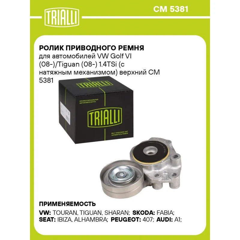 Ролик приводного ремня для автомобилей VW Golf VI (08-)/Tiguan (08-) 1.4TSi (с натяжным механизмом) верхний Характеристики: Артикул: CM 5381 OEM номера: 03C 145 299 J, 03C145299J Сопутствующие товары:: CM 5085, CM 3048, CM 5756, CM 5519, 6PK1698, 6PK1600, 6PK491 Сопутствующий товар: Ролики приводного ремня: CM 5085, CM 3048, CM 5756, CM 5519 Количество на автомобиль: 1 Внешний диаметр, мм: 76 Внутренний диаметр, мм: 10 Ширина, мм: 26 Гарантийный срок: 2 года/60 000 км. Сопутствующий товар: Ремни: 6PK1698, 6PK1600, 6PK491 Товарная линейка: BLACK Комплектация: Ролик привод. ремня с натяж. мех. - 1 шт Гарантия: от 1 года.