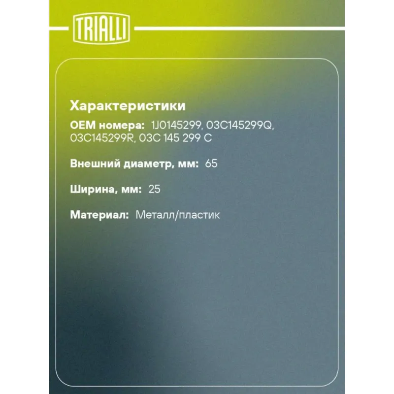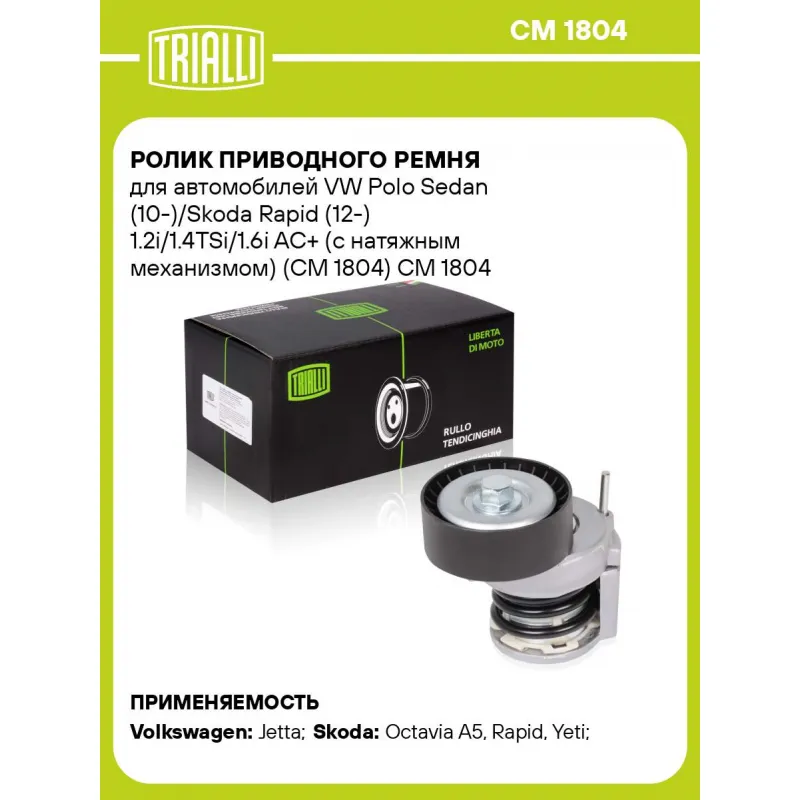 Ролик приводного ремня для автомобилей VW Polo Sedan (10-)/Skoda Rapid (12-) 1.2i/1.4TSi/1.6i AC+ (с натяжным механизмом) (CM 1804) Характеристики: Артикул: CM 1804 OEM номера: 1J0145299, 03C145299Q, 03C145299R, 03C 145 299 C Материал: металл/пластик Сопутствующий товар: Ролики приводного ремня: CM 1803, CM 5233 Количество на автомобиль: 1 Сопутствующие товары:: CM 1803,CM 5233, 6PK1733, 6PK1090 Внешний диаметр, мм: 65 Особенности конструкции:: механизм натяжения приводного ремня Внутренний диаметр, мм: 8 Ширина, мм: 25 Гарантийный срок: 2 года/60 000 км. Сопутствующий товар: Ремни: 6PK1733, 6PK1090 Товарная линейка: BLACK Подходит для авто: Volkswagen Jetta (11-) Skoda Octavia A5 (04-), Rapid (12-), Yeti (09-), Octavia A5 (04-), Rapid (12-), Yeti (09-) Для проверки применяемости отправьте VIN автомобиля через вкладку "Есть вопросы о товаре?" Комплектация: Ролик привод. ремня с натяж. мех. - 1 шт Гарантия: от 1 года.