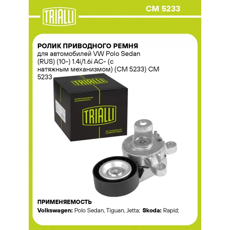 Ролик приводного ремня для автомобилей VW Polo Sedan (RUS) (10-) 1.4i/1.6i AC- (с натяжным механизмом) (CM 5233) Характеристики: Артикул: CM 5233 OEM номера: 6Q0145299A, 6Q0145299 Сопутствующие товары:: CM 1803,CM 1804, 6PK1733, 6PK1090 Сопутствующий товар: Ролики приводного ремня: CM 1803, CM 1804 Количество на автомобиль: 1 Внешний диаметр, мм: 65 Внутренний диаметр, мм: 10 Ширина, мм: 25 Гарантийный срок: 2 года/60 000 км. Сопутствующий товар: Ремни: 6PK1733, 6PK1090 Товарная линейка: BLACK Тип ролика: натяжной Подходит для авто: Volkswagen Polo Sedan (RUS) (10-), Tiguan (08-), Jetta (11-), Touran (03-), Golf VII (12-) Skoda Rapid (12-), Rapid (12-) Для проверки применяемости отправьте VIN автомобиля через вкладку "Есть вопросы о товаре?" Комплектация: Ролик привод. ремня с натяж. мех. - 1 шт Гарантия: от 1 года.