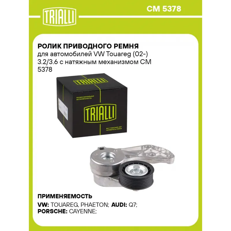 Ролик приводного ремня для автомобилей VW Touareg (02-) 3.2/3.6 с натяжным механизмом Характеристики: Артикул: CM 5378 OEM номера: 022 145 299 E, 955 102 299 00, 022 145 299E Сопутствующие товары:: CM 1010, 7DPK2074 Сопутствующий товар: Ролики приводного ремня: CM 1010 Сопутствующий товар: Ремни: 7DPK2074 Количество на автомобиль: 1 Внешний диаметр, мм: 72,5 Внутренний диаметр, мм: 9 Ширина, мм: 29 Гарантийный срок: 2 года/60 000 км. Материал: Комбинированный Товарная линейка: BLACK Комплектация: Ролик привод. ремня с натяж. мех. - 1 шт Гарантия: от 1 года.
