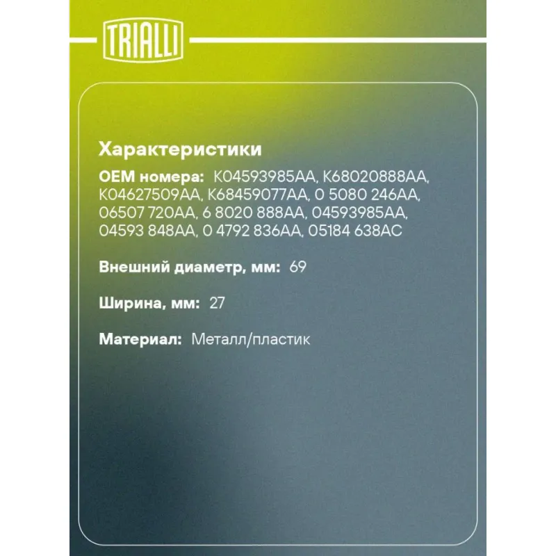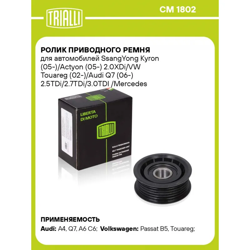 Ролик приводного ремня для автомобилей SsangYong Kyron (05-)/Actyon (05-) 2.0XDi/VW Touareg (02-)/Audi Q7 (06-) 2.5TDi/2.7TDi/3.0TDI /Mercedes Sprinter (00-)/M W164 (05-) (опорный) Характеристики: Артикул: CM 1802 OEM номера: K04593985AA, K68020888AA, K04627509AA, K68459077AA, 0 5080 246AA, 06507 720AA, 6 8020 888AA, 04593985AA, 04593 848AA, 0 4792 836AA, 05184 638AC, 05184 638AD, K05184638AD, K04627506AA, 2020019, A2722020000, 2722020000, 2020919, 000 202 00 19, 000 202 09 19, 272 202 08 19, 272 202 10 19, A 000 202 00 19, A 000 202 09 19, A 272 202 10 19, A 272 202 08 19, 95510211801, 059903341J, 059903341A, 059903341E, 6712000210, 665 200 31 70, 665 200 30 70, 66120-03170, 59903341J, 5080246AA, 04627851AA, 4627506AA, 5184638AD, 5281301AA, K04627851AA, K04792836AA, K05281301AA, 4593848AA, 4593985AA, 4627509AA, 4627851AA, 4792836AA Материал: металл/пластик Сопутствующий товар: Ролики приводного ремня: CM 5923 Количество на автомобиль: 1 Сопутствующие товары:: CM 1504, CM 5599, 6PK2271, 6PK2160, 6PK2390, 6PK2196, 6PK280, 6PK2065 Внешний диаметр, мм: 69 Особенности конструкции:: приводного ремня Внутренний диаметр, мм: 17 Ширина, мм: 27 Гарантийный срок: 2 года/60 000 км. Сопутствующий товар: Ремни: 6PK2100 Товарная линейка: BLACK Подходит для авто: Audi A4 (97-), Q7 (06-), A6 C6 (04-) Volkswagen Passat B5 (96-), Touareg (02-), Touareg II (10-) Для проверки применяемости отправьте VIN автомобиля через вкладку "Есть вопросы о товаре?" Комплектация: Ролик приводного ремня - 1 шт Гарантия: от 1 года.