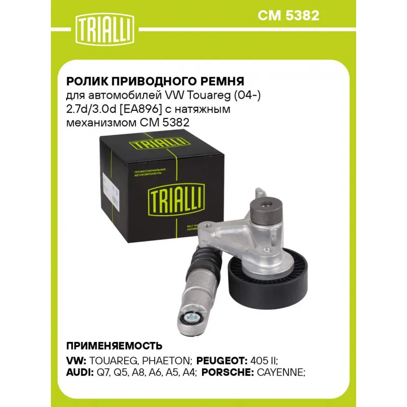 Ролик приводного ремня для автомобилей VW Touareg (04-) 2.7d/3.0d [EA896] с натяжным механизмом Характеристики: Артикул: CM 5382 OEM номера: 059145201D, 059145201F, 059145201H Сопутствующие товары:: CM 1802, CM 0955, CM 5790, 6PK2490, 6PK2475, 6PK2523 Сопутствующий товар: Ролики приводного ремня: CM 1802, CM 0955, CM 5790 Сопутствующий товар: Ремни: 6PK2490, 6PK2475, 6PK2523 Количество на автомобиль: 1 Внешний диаметр, мм: 75 Ширина, мм: 26 Гарантийный срок: 2 года/60 000 км. Материал: Комбинированный Товарная линейка: BLACK Комплектация: Ролик привод. ремня с натяж. мех. - 1 шт Гарантия: от 1 года.