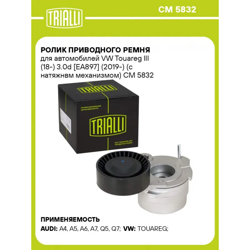 Ролик приводного ремня для автомобилей VW Touareg III (18-) 3.0d [EA897] (2019-) (с натяжнвм механизмом) Характеристики: Артикул: CM 5832 OEM номера: 059 903 133 AE, 059 903 133 Q, 059903133BB Сопутствующие товары:: CM 5791, CM 5833, CM 5834, CM 5792, 6PK2460, 6PK2415 Ширина, мм: 26 Внешний диаметр, мм: 70 Внутренний диаметр, мм: 10,2 Сопутствующий товар: Ремни: 6PK2460, 6PK2415 Количество на автомобиль: 1 Гарантийный срок: 2 года/60 000 км. Материал: Комбинированный Товарная линейка: BLACK Комплектация: Ролик привод. ремня с натяж. мех. - 1 шт Гарантия: от 1 года.