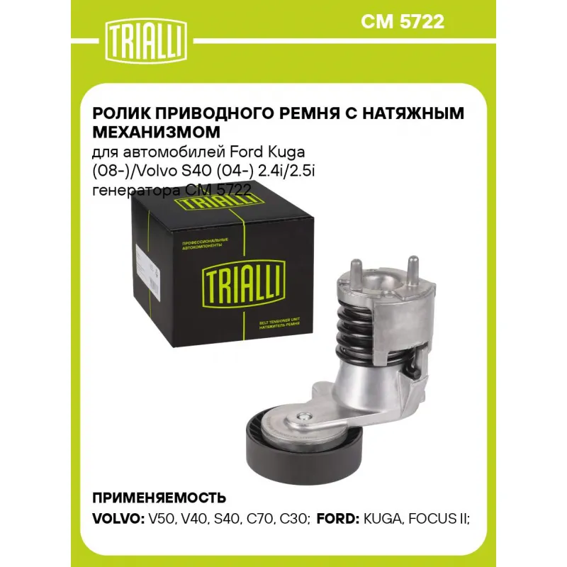 Ролик приводного ремня с натяжным механизмом для автомобилей Ford Kuga (08-)/Volvo S40 (04-) 2.4i/2.5i генератора Характеристики: Артикул: CM 5722 OEM номера: 1540603, 8M5N-6A228-AA, 31251653 Сопутствующие товары:: 5PK890, 5PK847, CM 5723 Сопутствующий товар: Ролики приводного ремня: CM 5723 Сопутствующий товар: Ремни: 5PK890, 5PK847 Количество на автомобиль: 1 Внешний диаметр, мм: 70 Ширина, мм: 20,5 Гарантийный срок: 2 года/60 000 км. Материал: Комбинированный Товарная линейка: BLACK Комплектация: Ролик привод. ремня с натяж. мех. - 1 шт Гарантия: от 1 года.