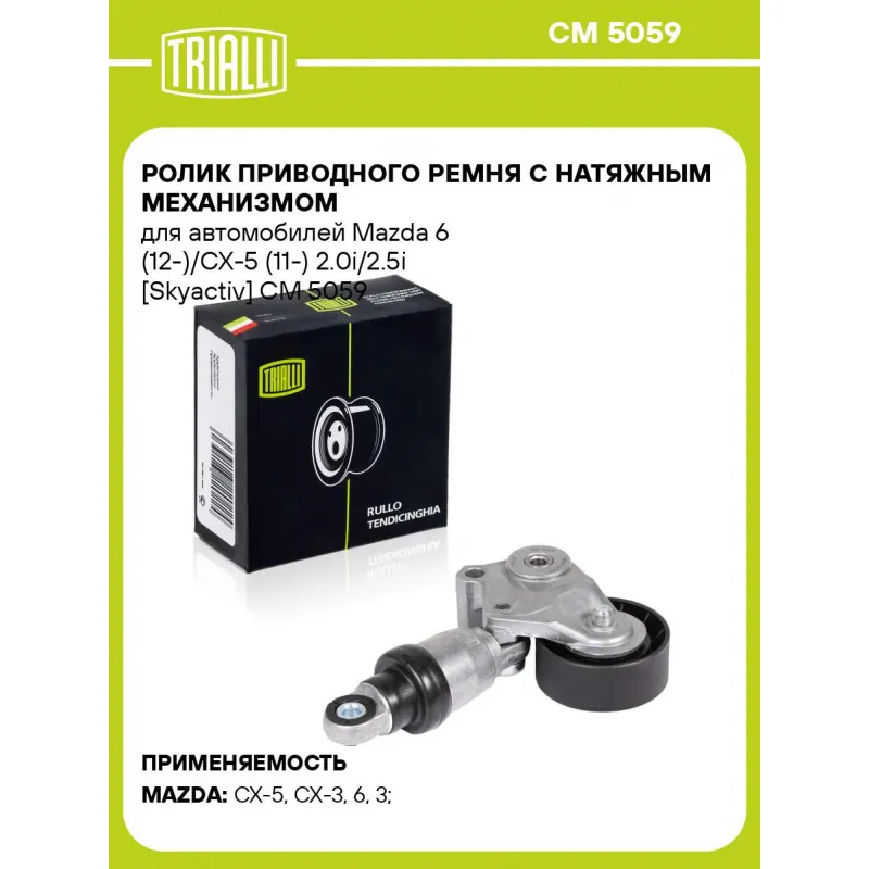 Ролик приводного ремня с натяжным механизмом для автомобилей Mazda 6 (12-)/CX-5 (11-) 2.0i/2.5i [Skyactiv] Характеристики: Артикул: CM 5059 OEM номера: PE03-15-980B, PE0315980, PE0315980A, PET215980 Сопутствующие товары:: CM 5732, CM 6089, 6PK955, CM 6PK962, CM 6PK970, CM 3PK790E, 3PK798E, 3PK817E Количество на автомобиль: 1 Внешний диаметр, мм: 65 Ширина, мм: 42 Гарантийный срок: 2 года/60 000 км. Материал: Комбинированный Товарная линейка: BLACK Комплектация: Ролик привод. ремня с натяж. мех. - 1 шт Гарантия: от 1 года.