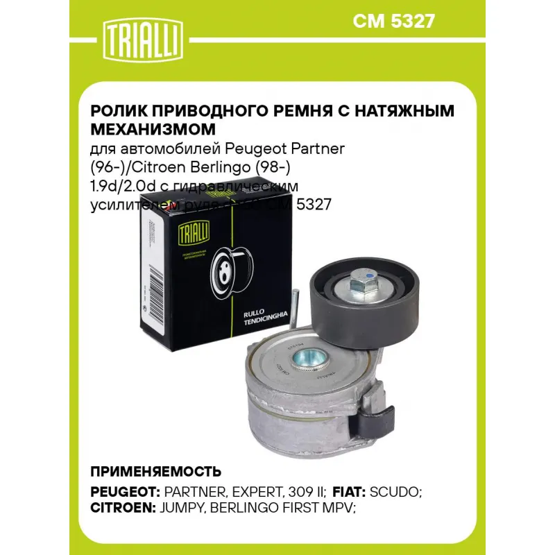 Ролик приводного ремня с натяжным механизмом для автомобилей Peugeot Partner (96-)/Citroen Berlingo (98-) 1.9d/2.0d с гидравлическим усилителем руля d=60 Характеристики: Артикул: CM 5327 OEM номера: 940 575 1949, 96535229, 9653522980, 327354, 327330, 327329, 327222, 5751-94, 94 057 519 49, 5751.94, 3273.54, 3273.30, 3273.29, 3272.22 Сопутствующие товары:: 6PK1750, 6PK1740, 6PK1693, 6PK1698, 6PK1468, 6PK1453, 6PK1153, 6PK1185, 6PK875, 6PK862, CM 5930, CM 5315 Сопутствующий товар: Ролики приводного ремня: CM 5930, CM 5315 Количество на автомобиль: 1 Внешний диаметр, мм: 60 Внутренний диаметр, мм: 10,2 Ширина, мм: 25,5 Гарантийный срок: 2 года/60 000 км. Материал: Металл Сопутствующий товар: Ремни: 6PK1750, 6PK1740, 6PK1693, 6PK1698, 6PK1468, 6PK1453, 6PK1153, 6PK1185, 6PK875, 6PK862 Товарная линейка: BLACK Комплектация: Ролик привод. ремня с натяж. мех. - 1 шт Гарантия: от 1 года.