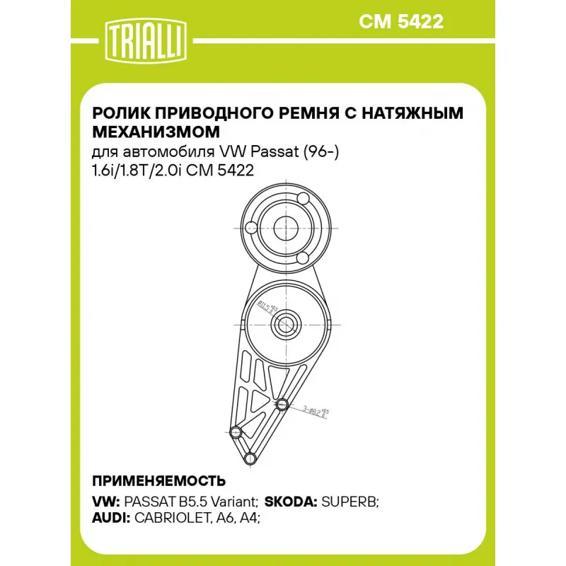 Ролик приводного ремня с натяжным механизмом для автомобиля VW Passat (96-) 1.6i/1.8T/2.0i Характеристики: Артикул: CM 5422 OEM номера: 058903133, 058903133B, 058903133C, 058903133D Сопутствующие товары:: CM 1838, 5PK1300, 4PK855 Сопутствующий товар: Ролики приводного ремня: CM 1838 Сопутствующий товар: Ремни: 5PK1300, 4PK855 Количество на автомобиль: 1 Внешний диаметр, мм: 76 Ширина, мм: 26 Гарантийный срок: 2 года/60 000 км. Материал: Комбинированный Товарная линейка: BLACK Комплектация: Ролик привод. ремня с натяж. мех. - 1 шт Гарантия: от 1 года.