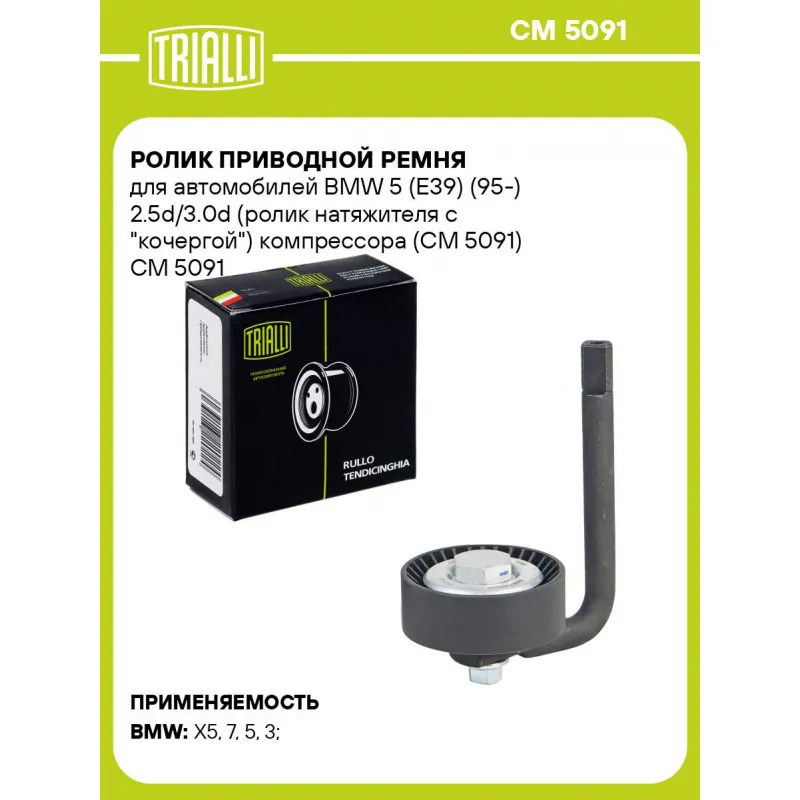 Ролик приводной ремня для автомобилей BMW 5 (E39) (95-) 2.5d/3.0d (ролик натяжителя с "кочергой") компрессора (CM 5091) Характеристики: Артикул: CM 5091 OEM номера: 64557786287, 64557788684, LGQ000040 Сопутствующие товары:: 5PK2060, 4PK813, CM 5092, CM 5676, CM 5677, CM 5108, CM 5856 Сопутствующий товар: Ролики приводного ремня: CM 5092, CM 5676, CM 5677, CM 5108, CM 5856 Количество на автомобиль: 1 Внешний диаметр, мм: 70 Ширина, мм: 26 Гарантийный срок: 2 года/60 000 км. Сопутствующий товар: Ремни: 5PK2060, 4PK813 Товарная линейка: BLACK Комплектация: Ролик приводного ремня - 1 шт Гарантия: от 1 года.