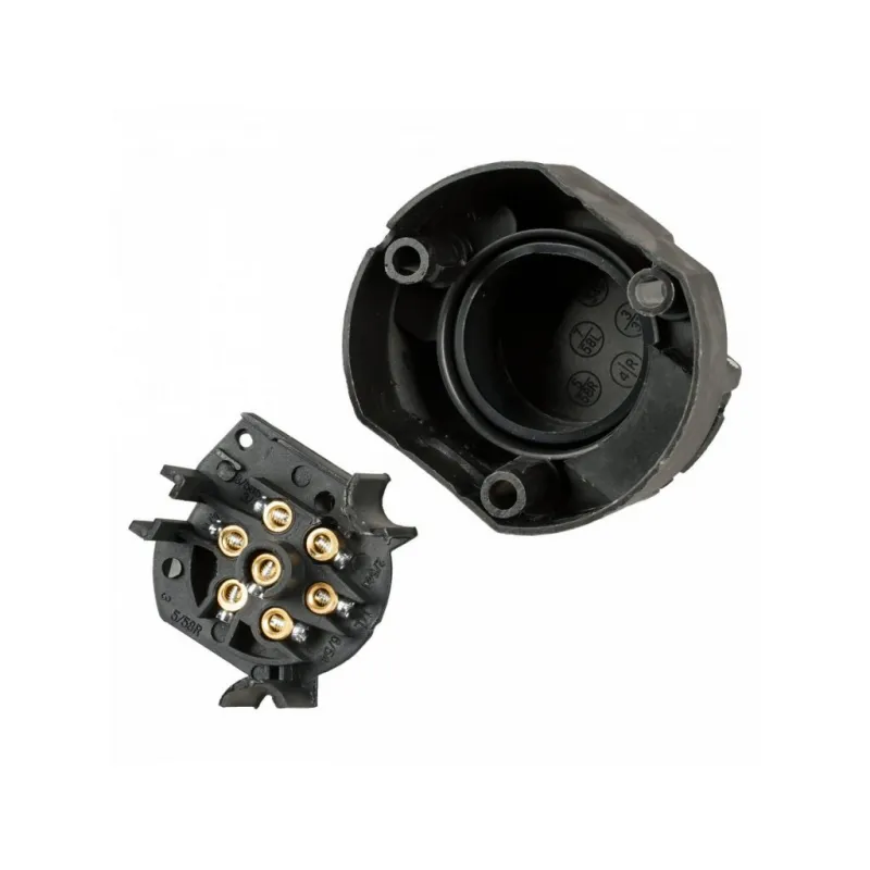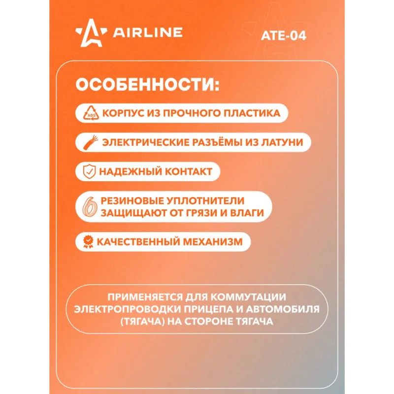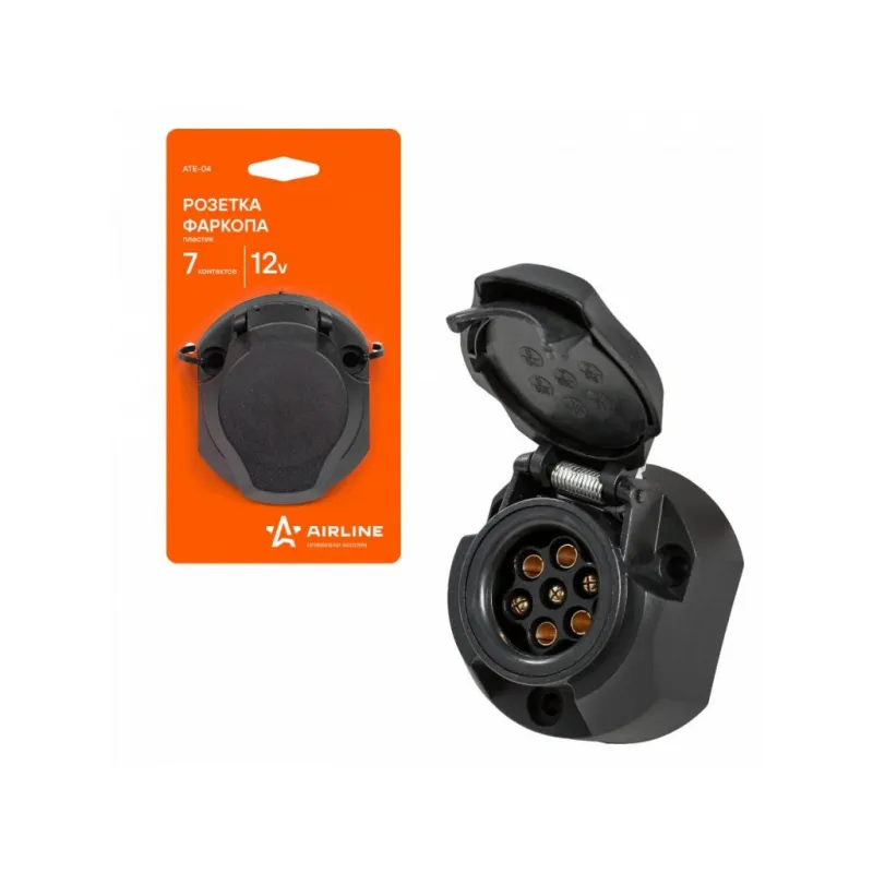 Розетка фаркопа 12В 7 контактов пластик Описание: Розетка для фаркопа 12 В, 7 контактов AIRLINE ATE-04 - корпус розетки выполнен из прочного пластика. Электрические разъёмы из латуни обеспечивают надёжный контакт. Резиновые уплотнители защищают от грязи и влаги. Особенности: * Корпус из прочного пластика; * Электрические разъемы из латуни для обеспечения надежного соединения; * Надежный контакт; * Резиновые уплотнители защищают от грязи и влаги; * Качественный механизм; Применяется для коммутации электропроводки прицепа и автомобиля (тягача) на стороне прицепа. Для самостоятельного подключения автоприцепа к автомобилю необходимо использовать разъем розетки прицепа (вилка-розетка). Соединение осуществляется путем соединения розетки, установленной на фаркопе, с соответствующим разъемом, подключенным к проводке прицепа. Товар официального производителя AIRLINE. Характеристики: Артикул: ATE-04 Количество контактов: 7 Материал корпуса: пластик Комплектация: Розетка фаркопа - 1 шт Гарантия: от 1 года.