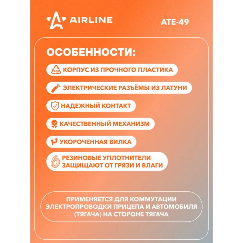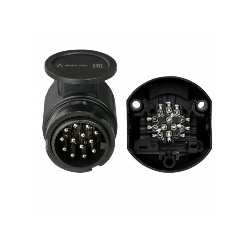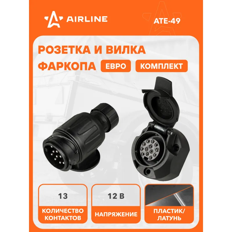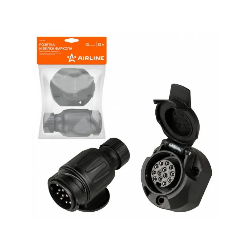 Розетка и вилка фаркопа 12В 13 контактов ЕВРО пластик комплект (вилка укороченная) Описание: Розетка и вилка для фаркопа 12 В, 13 контактов, ЕВРО пластик комплект (вилка укороченная), AIRLINE ATE-49 - комплект, корпус розетки и вилки выполнен из из прочного пластика Электрические разъёмы из латуни обеспечивают надёжный контакт. Резиновые уплотнители защищают от грязи и влаги. Особенности: * Корпус из из прочного пластика; * Электрические разъемы из латуни для обеспечения надежного соединения; * Надежный контакт; * Резиновые уплотнители защищают от грязи и влаги; * Качественный механизм; Применяется для коммутации электропроводки прицепа и автомобиля (тягача) на стороне прицепа. Для самостоятельного подключения автоприцепа к автомобилю необходимо использовать разъем розетки прицепа (вилка-розетка). Соединение осуществляется путем соединения розетки, установленной на фаркопе, с соответствующим разъемом, подключенным к проводке прицепа. Товар официального производителя AIRLINE. Характеристики: Артикул: ATE-49 Количество контактов: 13 Материал корпуса: пластик Комплектация: Розетка фаркопа - 1 шт Вилка фаркопа - 1 шт Гарантия: от 1 года.