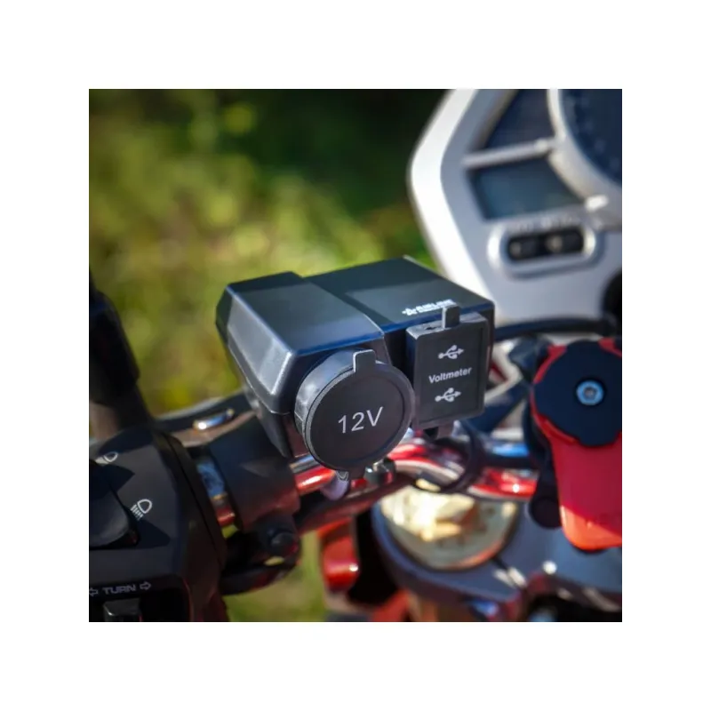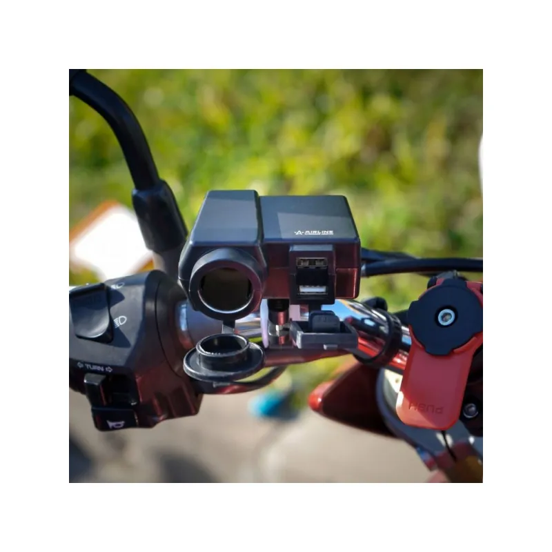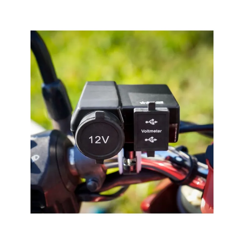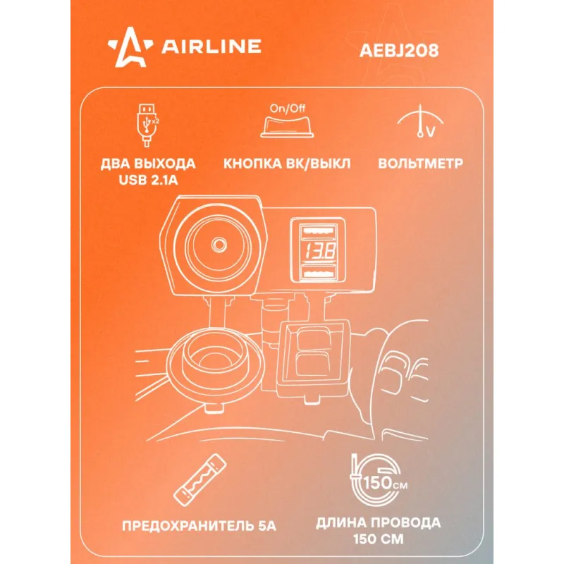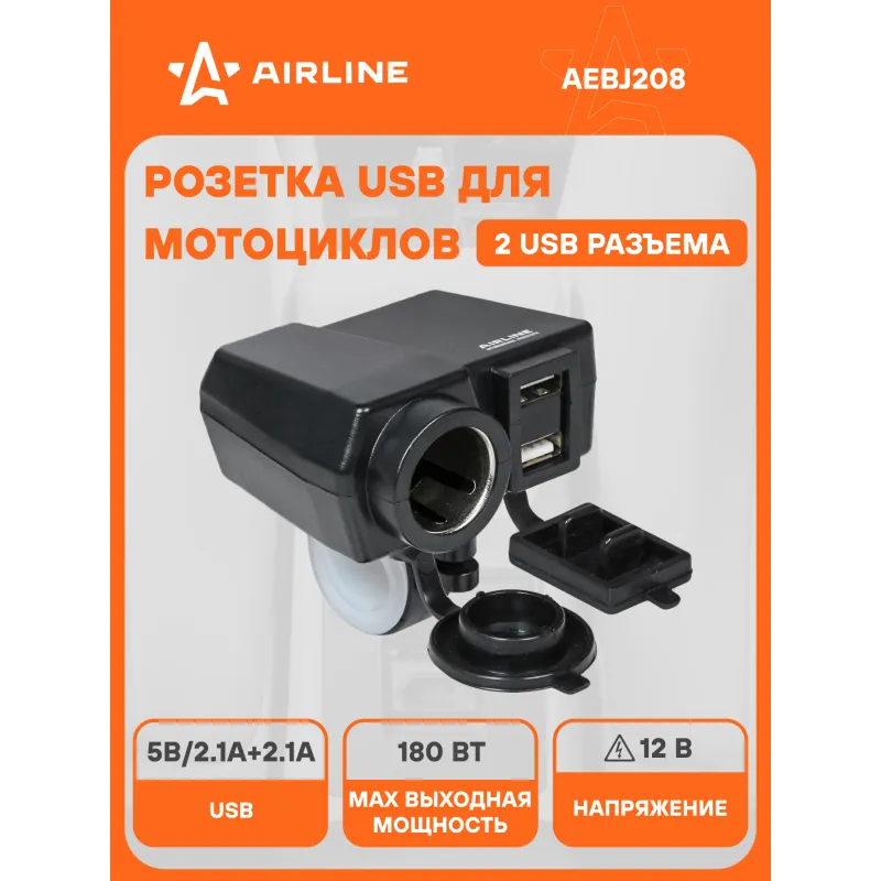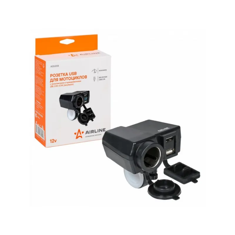 Розетка USB для мотоциклов с вольтметром и прикуривателем (5В, 2.1А+2.1А) (вкл/выкл) Описание: Розетка с USB с вольтметром и прикуривателем 12 В встраиваемая, для мотоциклов, 2 порта USB AIRLINE AEBJ208 устанавливается на руле мотоцикла, скутера, квадроцикла. Подключается к аккумулятору. Позволяет заряжать и подключать любые устройства от порта USB и прикуривателя. Розетка закрывается брызгозащитной резиновой заглушкой. Для более удобной установки в комплекте вам предоставляется 2 шурупа и панель. Также розетку можно использовать в автобусе, троллейбусе, автодоме, микроавтобусе, мотоцикле и т.д. Особенности устройства: 2 выхода USB - 5В/2.1А+2.1А; Предохранитель 5А - 2 шт; Длина провода 150 см; Простота установки и эксплуатации. Защита от перегрузки. Защита от перегрева. Защита от короткого замыкания. Также розетка оборудована вольтметром. Главным преимуществом является сенсорная кнопка включения и отключения розетки. Вы в любой момент можете отключить вольтметр, чтобы он вам не мешал. Розетка с USB имеет водонепроницаемую крышку, которая защищает разъем прикуривателя от попадания в нее воды. Подойдет для подключения любых устройств USB: автомобильную зарядку, навигаторы, мобильные телефоны, смартфоны, планшеты, навигация, GPS и др. Товар официального производителя AIRLINE. Розетка USB - это полезный подарок автомобилисту, мужчине и женщине, автолюбителю, папе, отцу, мужу, парню и другу, позволит заряжать ваши устройства в пути и всегда оставаться на связи. Характеристики: Артикул: AEBJ208 Максимальный ток, А: 15 Напряжение питания, В: 12 Максимальная выходная мощность, Вт: 180 Параметры USB: 5В/2.1А+2.1А Вкл/выкл: Да Предохранитель, А: 15 Длина провода, см: 150 Комплектация: Розетка - 1 шт Крепление на руль - 1 шт Предохранитель дополнительный - 2 шт Крепление на панель - 1 шт Саморез - 3 шт Болт + гайка - 1 шт Гарантия: от 1 года.
