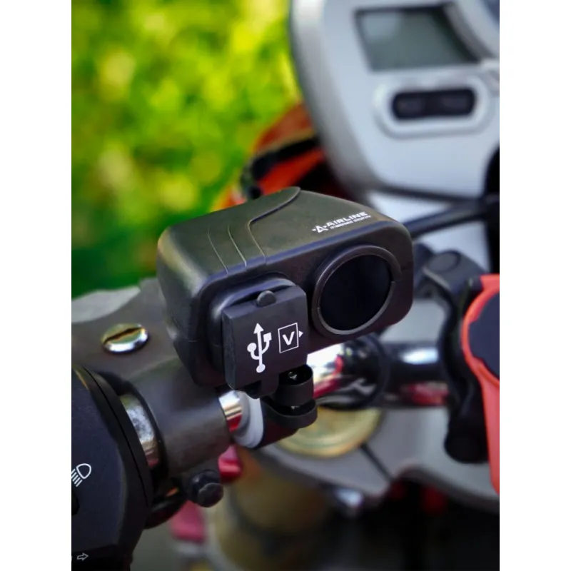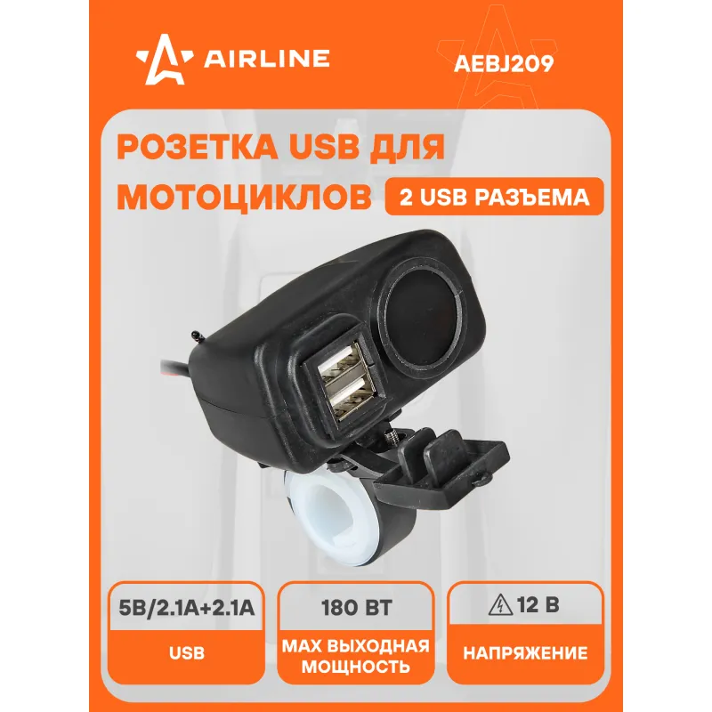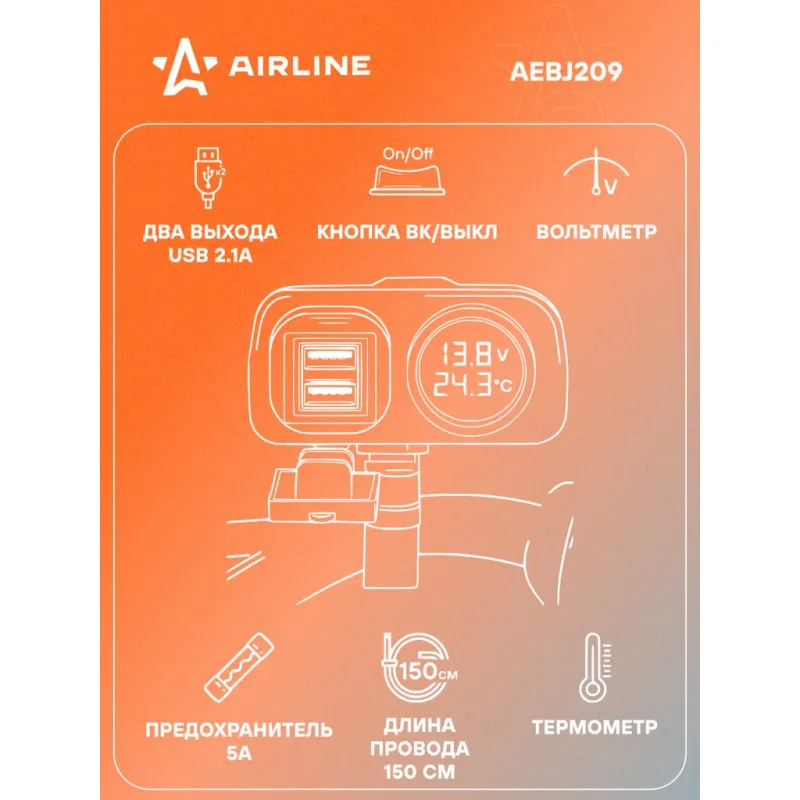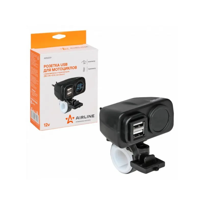 Розетка USB для мотоциклов с вольтметром и термометром (5В, 2.1А+2.1А) (вкл/выкл) Описание: Розетка с USB с вольтметром и термометром 12 В встраиваемая, 2 порта USB AIRLINE AEBJ209 устанавливается на руле мотоцикла, скутера, квадроцикла. Подключается к аккумулятору. Позволяет заряжать и подключать любые устройства от порта USB и прикуривателя. Также розетка показывает температуру окружающей среды. Розетка закрывается брызгозащитной резиновой заглушкой. Для более удобной установки в комплекте вам предоставляется 2 шурупа и панель. Также розетку можно использовать в автобусе, троллейбусе, автодоме, микроавтобусе, мотоцикле и т.д. Особенности устройства: 2 выхода USB - 5В/2.1А+2.1А; Предохранитель 5А - 2 шт; Длина провода 150 см; Простота установки и эксплуатации. Защита от перегрузки. Защита от перегрева. Защита от короткого замыкания. Также розетка оборудована вольтметром. Главным преимуществом является сенсорная кнопка включения и отключения розетки. Вы в любой момент можете отключить вольтметр, чтобы он вам не мешал. Влагозащищенная крышка; Розетка с USB имеет водонепроницаемую крышку, которая защищает разъем прикуривателя от попадания в нее воды. Подойдет для подключения любых устройств USB: автомобильную зарядку, навигаторы, мобильные телефоны, смартфоны, планшеты, навигация, GPS и др. Товар официального производителя AIRLINE. Розетка USB - это полезный подарок автомобилисту, мужчине и женщине, автолюбителю, папе, отцу, мужу, парню и другу, позволит заряжать ваши устройства в пути и всегда оставаться на связи. Характеристики: Артикул: AEBJ209 Максимальный ток, А: 15 Напряжение питания, В: 12 Максимальная выходная мощность, Вт: 180 Параметры USB: 5В/2.1А+2.1А Вкл/выкл: Да Предохранитель, А: 5 Длина провода, см: 150 Комплектация: Розетка - 1 шт Крепление на руль - 1 шт Предохранитель дополнительный - 2 шт Крепление на панель - 1 шт Саморез - 3 шт Болт + гайка - 1 шт Гарантия: от 1 года.