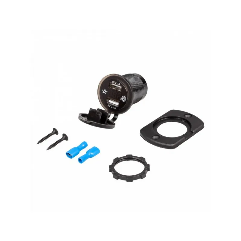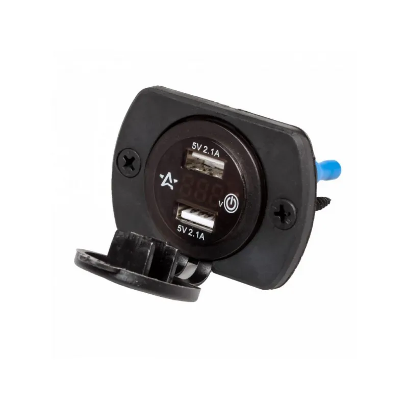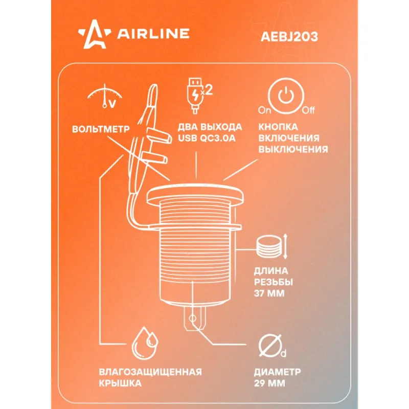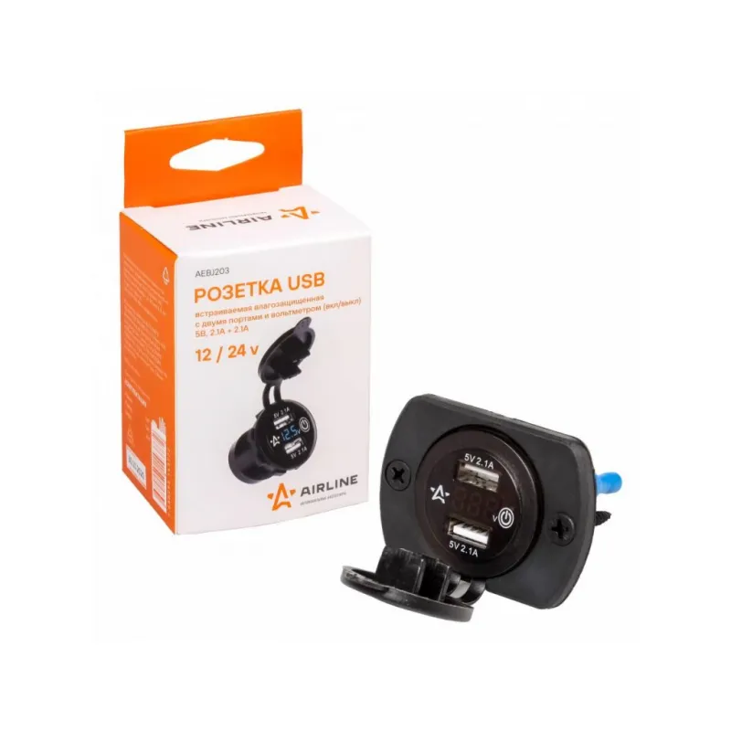 Розетка USB встраиваемая влагозащ. с 2 портами и вольтметром (вкл/выкл) (5В, 2.1А + 2.1А) Описание: Розетка с USB и вольтметр 12/24 В 4,2А влагозащищенная встраиваемая, 2 порта USB AIRLINE AEBJ203 устанавливается в салоне автомобиля или другого транспортного средства. Подключается к бортовой сети автомобиля 12/24 В. Позволяет заряжать мобильные устройства от двух портов USB с суммарным током 4.2А. Розетка закрывается брызгозащитной резиновой заглушкой. Для более удобной установки в комплекте вам предоставляется 2 шурупа и панель. Также розетку можно использовать в автобусе, троллейбусе, яхте, автодоме, микроавтобусе, катере, мотоцикле и т.д. Особенности устройства: 2 выхода USB - 5В, 2.1А + 2.1А; Длина резьбы 37 мм; Диаметр 29 мм; Простота установки и эксплуатации. Защита от перегрузки. Защита от перегрева. Защита от короткого замыкания. Также розетка оборудована вольтметром. Главным преимуществом является сенсорная кнопка включения и отключения розетки. Вы в любой момент можете отключить вольтметр, чтобы он вам не мешал. Влагозащищенная крышка; Розетка с USB имеет водонепроницаемую крышку, которая защищает разъем прикуривателя от попадания в нее воды. Подводимая проводка должна иметь сечение не менее 0.5 мм.кв. Обязательна установка предохранителя номиналом 5А в цепь питания дополнительного гнезда прикуривателя. Подойдет для подключения любых устройств USB: автомобильную зарядку, навигаторы, мобильные телефоны, смартфоны, планшеты, навигация, GPS и др. Товар официального производителя AIRLINE. Розетка USB - это полезный подарок автомобилисту, мужчине и женщине, автолюбителю, папе, отцу, мужу, парню и другу, позволит заряжать ваши устройства в пути и всегда оставаться на связи. Характеристики: Артикул: AEBJ203 Напряжение питания, В: 12/24 Максимальный выходной ток: 4,2А Параметры USB: 5В, 2.1А + 2.1А Вольтметр (on/off): Да Комплектация: Розетка USB - 1 шт Панель - 1 шт Шуруп - 2 шт Гарантия: от 1 года.
